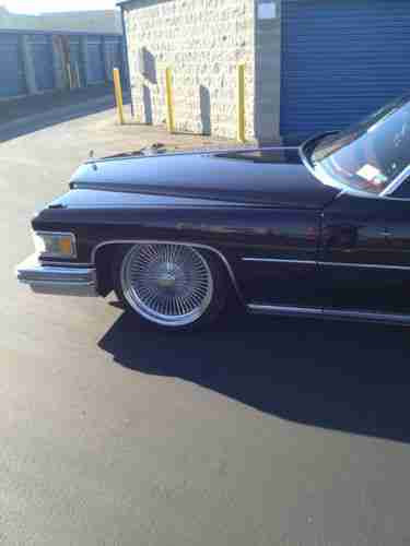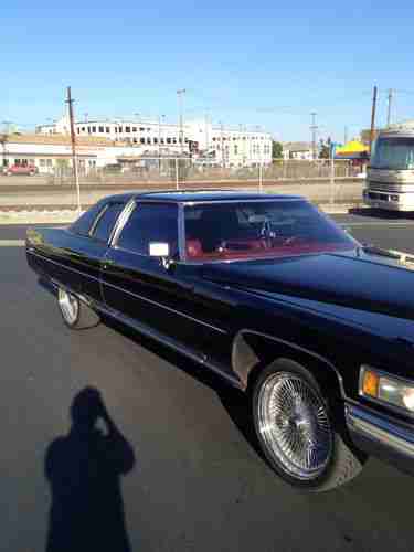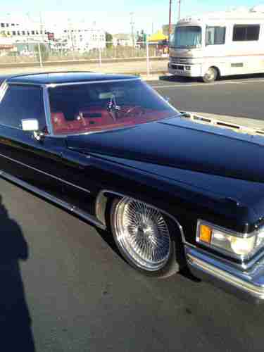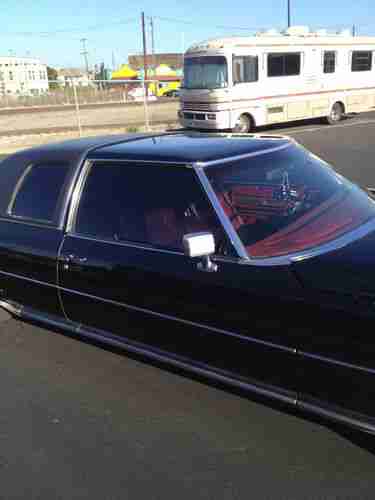 1975 Cadillac Coupe DeVille Lowrider. Black w/ red leather. 20" Spoke wheels, stereo. All receipts from 2003 on for mechanical work. 75xxx original miles. 10 switch air suspension with 2-5 gallon chrome tanks and compressors. Pancake, see saw, left side, right side, all 4 tires, and front and back switches. No leaks in the air ride. The car will hold air all the way up for 2-3 days with no noticeable drop. Red neon ground effect lighting and full stereo (factory speakers and unit replaced) with subs.