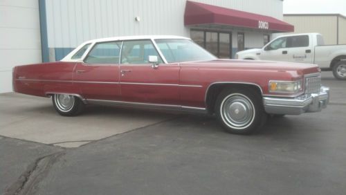 No reserve price, no games!! Offered for your consideration is this 1976 Cadillac Sedan deVille with approximately 84,000 actual miles! I purchased this car about 1 year ago from a young man who had purchased it from the estate of the original owner approximately 2 years prior to that. There is NO RUST of any kind anywhere on this car as it was always kept in Arizona by its original owner. It has not been driven in Winter months since returning to Iowa. The paint is sun-faded and it has had panel paint repairs over the years. The owner prior to me had practiced his buffing on this car and there are some sharp edges where the paint has been burned through. The right-front door has a sizeable dent down low. The factory radio was replaced by its last owner with an after-market stereo. The leather seats are still soft and very presentable, but the white interior door panels have dried out from the Arizona sun and have extensive damage. The rear bumper fillers/quarter panel extensions have been replaced with the more rigid aftermarket extensions. The car runs and drives well, but the brake pedal is getting soft which tells me that it is probably about due for a new master cylinder. The trunk pull-down and release still work perfectly. All four window motors work well, but the right-rear window needs one of the plastic guides replaced as it becomes cocked when going up and down without assistance. 4 matching tires are in good condition. This car is not pristine by any means, but it is a very deserving, strong running, low mileage, Arizona car that needs to be preserved! This car will sell for the highest bid of $2500 or more! Please feel free to e-mail me with any questions that you might have. $500 non-refundable deposit due within 48 hours of auction through close through PayPal, with the balance due within 7 days. I have lost my storage, so the vehicle must be picked up by October 1st. Thanks for looking!!