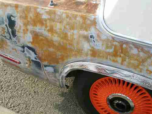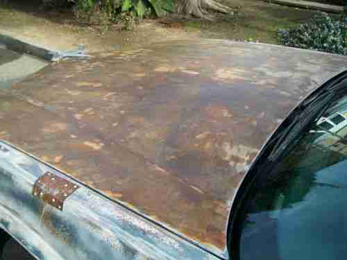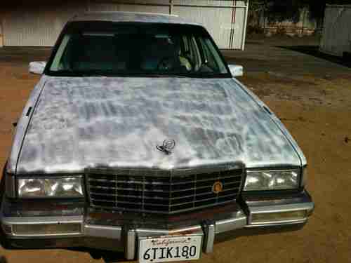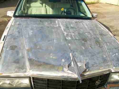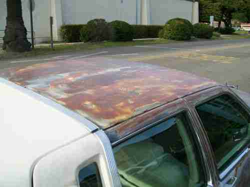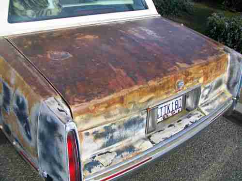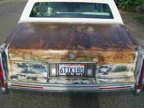 The first picture you see is what the car looked like when I purchased it over a year ago. I bought the car to experiment with giving a car a natural patina look and using my art skills I accomplished a bad-ass look on the hood, top, and trunk lid, the remainder of the car I was more subtle and had to be because the front left and right fenders are abs plastic and I painted them to look rusted (see photos). I bought this car from the second owner who was a Union 76 service station owner in my town. The title is clear and in my name, this is NOT a flip or story about the car is a friend's and I'm selling it for them... This is my car! With that out of the way, at 142,466 miles the car was given a new set of Michelin Harmony 95T tires all the way around. P205/70R15, a full lube job, windshield wipers, smog inspection( and yes it did pass, California is real particular about that). At the same time, the serpentine belt was replaced, the cooling system was serviced, and the car was made road ready. It's fun to drive and you definitely get the looks, more on that in a minute. Yes, the wheels are orange, they are NOT painted, they were professionally powder-coated by Armando at PERMACOLOR in my town. Center caps were purchased new on ebay and installed. On December 3, 2012 a new First Interstate battery was installed, along with BG pad protectors. The car was professionally lowered by the award-winning team at Scott's Hotrods N Customs in Oxnard, Ca. Cadillacs have an automatic load lifter so when people sit in the back seat the car will raise up, this was disconnected, but not removed and if desired it can be reconnected. The factory radio works only sometimes, it has a cassette player, but I will include a new Kenwood KDC stereo radio and CD player in the box in the purchase... ya gotta have tunes. There is a crusty bubble at the side rear of the drivers side, just up and left of the gas filler door. (see photos) and the trunk will close, but it's a little tricky and does take some finesse. Dependable, YES... I had the car gone through so that it is always road-ready, starts right up and when you put your foot down, the car knows what you want to do., Headlamps, turn signals, brake lights, dome light, door lights, back up lights, license plate lights all work, gauges work fine and the mileage is true. Brakes are fine and the tranny and engine perform as they should. Lots of room in this car. The interior is white and in great condition, although the seats could use a good scrubbing, personally, I would have them dyed white, it's faster and they would look new if you did. The carpet and dash are blue, vinyl top is in good condition. I addedd a Stroh's Beer Tap to the selector, it's old, since it has Detroit 26, Michigan rather than a zip code on it. (see photo) I yellowed the front turn signals and blacked out the grille center see photo and compare to the original shot of the car.