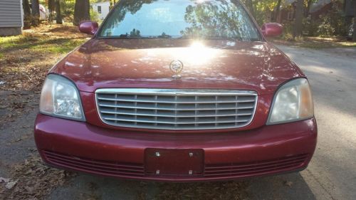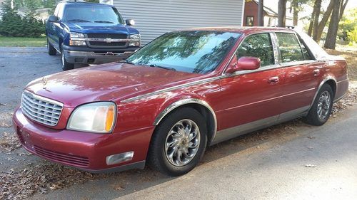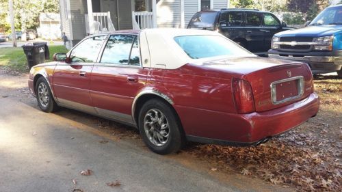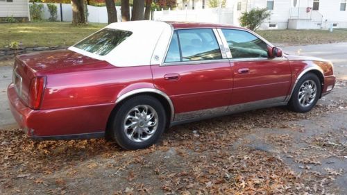 Up for sale is my Village Edition Unique Burgundy 2002 Cadillac Deville the body is in good condition with no rust/rot at all. Has some scratches and wear for being 13 years old. The paint shines like new, The tires have more than 60 % thread left. The interior is in mint condition,it is grey leather and very clean and with no tears. the a/c is cold and the heat works great too. We have a clean title in hand, anyone is more than welcome to come check this car anytime, It is being sold AS IS where is, at auction NO WARRANTIES EXPRESSED OR IMPLIED. It is being stored in my garage until purchase. There is a inspection sticker is on the car!!! TAKE A LOOK AT THE PICTURES !!!!! veryUNIQUE CAR, TOOK IT ON THE HIGHWAY FOR A 2 HOUR RIDE, THERE IS NO OVER HEATING, NO SLIPS OR KNOCKS !!!!!!!!!!!!! DEFINATELY ONE OF A KIND. The white leather top is in excellent condition for being 11 years old.