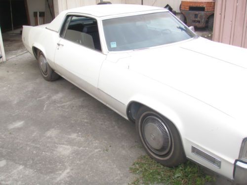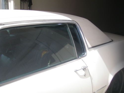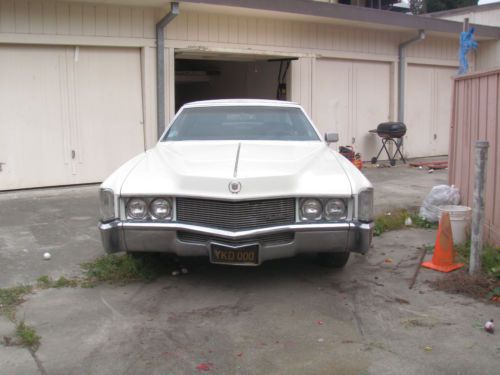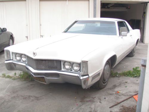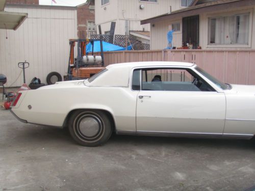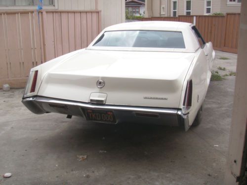 Selling this one owner, 1969 Cadillac Eldorado. It is finished in white on blue. It appears to have been repainted once. It still has the original owner's manual, Cadillac Protecto Plate, sales invoice and warranty card. It is a California car. The white vinyl top is in good condition. The top of the driver's seat does have a tear(see photo and video). The Eldo runs good and drives good. I would personally drain all the fluids and bleed the brakes. The Eldo has been in storage for over 20 plus years. The driver's side door panel does have some wear(see photo and video). The rear seats look good. The headliner is not sagging and the dash is not cracked. If you have been looking for a decent Eldo, then here is your chance to buy one for NO RESERVE. Final bid gets to take her home.