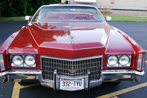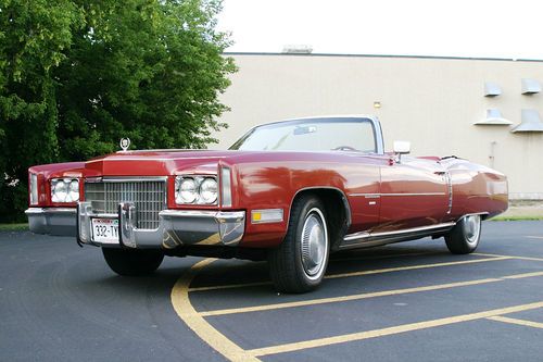 1971 CADILLAC ELDORADO CONVERTIBLE-1971 was the first year of production for this body style-known as "The Last of the Great American Convertibles". This car is a stunning 2 owner car that was well maintained while the owner was driving it but he died in 1989 and the car was put in dry storage and wasn't driven between 1989 until 2012 (when we bought it). We've spent over $3,000.00 since we bought it replacing items that it needed to make it safe, reliable and road-worthy. It's former owner was very active in our local American Legion so it was used for almost 20 years as a parade car for Flag Day, Veteran's Day and the 4th of July in our hometown-it even has flag holders installed on the right side of each headlight to hold parade flags and a VERY loud PA speaker that's hidden in the grill of the car (Photo #24 shows the Legionnaires getting ready for a parade in 1983). It also has some type of music device with a small keyboard controller that lets you choose from 88 different computerized songs along a parade route. We've installed new tires ($879.00), a complete braking system w/ new rotors,calipers, master cylinder,vacuum booster, brake proportioning valve, and some brake lines ($1,376.00), had it tuned up ($341.00) and the fuel pump was replaced ($247.32). We also had it professionally detailed/cleaned (they cleaned the top and used a cleaner/sealer on it) ($211.00), recently had a new power antenna installed at the stereo place when we couldn't figure out how to turn off the CB radio ($67.00) it was removed but it's all in the trunk if you plan on going cross-country with it.) It currently has an AM/FM Cassette player with what we believe to be the original speakers. It has a strong-running 8.2 L/500 CID engine (365 HP/535 LB-FT) and it shifts well when purring around the city or under full acceleration. It had an oil leak so they replaced the oil pan gasket and they also replaced the transmission pan gasket at that time ($344.00). The car was completely repainted in the original Cambridge Red Metallic in fall of 1987 after a deer incident and it also had it's original vinyl top replaced at that time. The original engine was rebuilt at 138,000 miles by our local Cadillac dealer and it currently shows 56,162 miles (which is actually 156,162 miles in this case) so if my math is correct, it has 18,162 miles on the rebuilt engine. The A/C doesn't blow very cold and the top can be stubborn returning to the "UP" position sometimes (We've had to "assist" it once or twice last year and we don't know where to take it to fix that in this area) We've had the top in the "down" position with the boot installed for well over a year now and the mechanic told us to cycle it up and down frequently to work that out. There are also 3 missing/broken push-down snaps on the boot cover. The top is clean, sealed, and in very good condition but we were told it needs new weatherstripping between the front (2) windows and windshield. There's some plastic worn off the steering wheel and it also has a crack in the vinyl door panel on the driver's side armrest (see picture). The rest of the interior has the amount of wear you'd expect on a 42 year-old original interior but no tears/rips in the leather but shows some wear on the center fold-down armrest. It has no rust on the body but we were told it's had new panels installed under both front seats at some time. So as you can see, it's a very nice car with a few correctable flaws but remember, it's 42 years old and we've driven this car EVERWHERE since we bought it-it's very reliable. You'll love the attention it gets-it's truly a head-turner wherever we take it and it always gets alot of compliments. We've also had it in 4 car shows, 2 PARADES!, and taken it on numerous family trips all over the state without a single problem. Sadly enough, with a daughter starting college next month and another daughter getting married at the end of October, we've being forced by our terrible kids to send our beautiful convertible to a new home. If you have any questions, feel free to call us at (920) 585-6633. Good Luck and Happy Bidding!