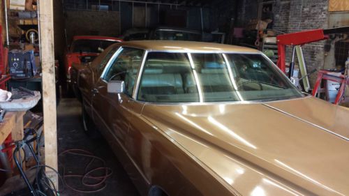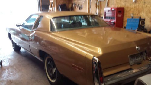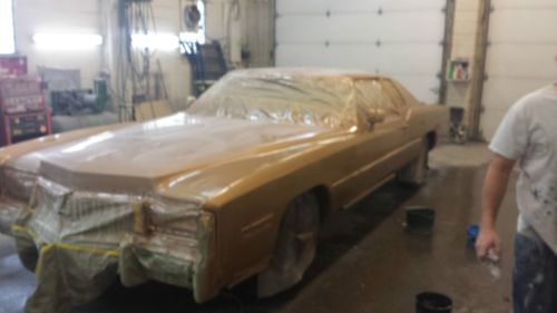 here i have my 77 cadillac eldorado. i purchased this car about a year ago. the person that had it painted it white and didnt really know what he had. well i bought it and put it back to its original state. the color is gold with a cream color top. however in the pictures it doesnt show the top on, we are in the process of getting it installed. i have been looking for something called a halo seam that is required to install the top. the paint is fresh and i would say is a 7 out of 10 right now it is getting wet sanded and buffed to add the pin stripes. i have gone over the whole car and she is ready for them nice sunday drives or everyday drives. all the brakes have been gone over . all the fluids changed. everything works even the power seats. the engine believe it or not runs really smooth, cant even hear the thing run. no ticking at all. it is the original drivetrain. and it is front wheel drive. tires are brand new and i have the original rims also. engine has had a tune up also. the undercarriage is really clean no rust. chrome is there and the plastics are not broken. seats are clean with no tears. carpet is clean as well. it will be going to the detail shop sometime next week to clean everything one last time before it gets sold. last week we drove it 80 miles to and from and it was like floating on the highway. you cant feel any bumps smooth ride. feel free to ask any questions these cars are going for alot of money now a days. i have been looking the past three months and seen them selling for as high as 10000. my price is really fair, as i just want to get it out of my shop and start on something else.
