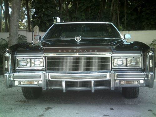 1977 Cadillac Eldorado. one owner up to 2013 who assured me verbally that the 62k miles were original. miles. and claimed it was never his primary vehicle. recent exhaust. just replaced battery. otherwise all systems tested and proved. recent paint and plastic fillers. tires 50%. has r-12 system but blows cold. my temperature gun indicates in the 40 degree region at air con vents. when engine hot, temperature gun indicates about 180 degrees at thermostat. runs smooth without missing. no blow by when oil cap removed while engine operating. exhaust shows no smoke. it is the basic Eldorado. interior good without dash cracks. ceiling still tight. all exterior and interior lights work. day or night, spectators always approach in interest and awe. kept wrapped in car cover on daily basis. Located in fort Lauderdale. and FOR SALE BY OWNER not by a dealer that demands some nonsense "dealer fee" . paul @ 954-270-3649