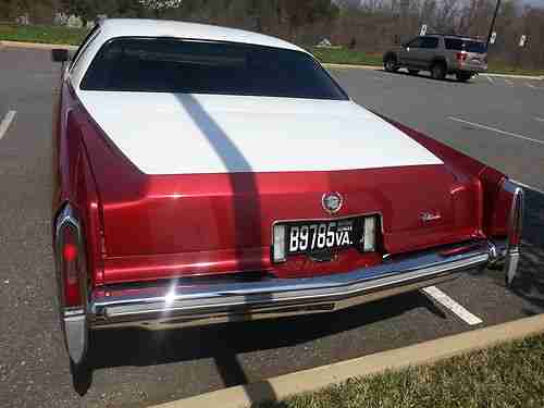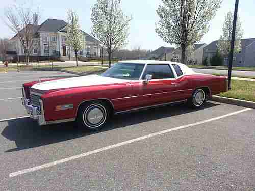 I am selling a 1978 Cadillac Eldorado. The car is clean with a little over a year paint job. It does have some minor chipping here and there, but definitely a great clean paint job that was done right. Two tone red and white. Interior is Red leather. Driver seat is worn on the edge and the driver door is worn. Passenger seat is good. The back seats are perfect. The headliner is perfect. The dash has 2 cracks. There is no rust on the vehicle. The vehicle runs well and is all original with the factory hubcaps. Has factory AC that needs to be charged. Heat works well. It has power windows, power locks, power seats, cruise control, and a power Antenna. I would consider this a good driving small project to get back to showroom quality. Has a new carburetor, glass molding, new radiator, and altenator. Does have a minor hesitation here and there in which it would require a good tune up. The engine is quiet and is turn key. Factory AM/FM radio does work, however does has an aftermarket Alpine head unit with JL Audio speakers, 2 JL Audio amps, and JL 12in sub. Also has a LCD keyless entry alarm with trunk release. The car does need a right hood hinge in which I ordered and will go with the purchase of the vehicle. I have the original owners manual as well. Clean title in hand. Only reason for selling, 2 many projects and want to give someone a really nice small project that they will appreciate. A great weekend cruiser or everyday driver. It also has a valid Va inspection good thru 12/13 and has passed emissions good for 2 years.