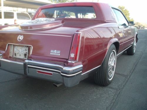 1985 CADILLAC ELDORADO BARRITZ - CLASSIC; 46K ORIGINAL MILES; GORGEOUS! CLASSY; BEAUTIFUL WINE RED INTERIOR AND EXTERIOR COLOR; ABSOLUTELY NO RIPS, CRACK OR TEARS IN THE INTERIOR; HEADLINER SLIGHTLY LOOSE; CASSETTE TAPE STUCK; RIGHT FRONT FILLER SLIGHTLY CRACKED; CAR IS GARAGED AND ON NON-OP STATUS; COMPLETE CLASSIC; STRAIGHT BODY; NO SCRATCHES OR DINGS; A HAIRLINE FROM SHOWROOM CONDITION!!!!! BUYER MUST PAY AND PICK UP WITHIN 48 HOURS OF CLOSING OF BID!