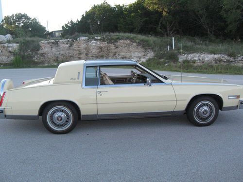 I am selling this car for my elderly Mom who can no longer drive. This is a 1985 Eldorado Biarittz with only 25,900 actual miles. My Mom bought this car in 1987 at an estate sale from her friend. Only driven on fair weather days to church or grocery store. It comes with most every option as well as digital gauges and readouts. The stainless roof and landau vinyl roof are in excellent condition as is the rest of the vehicle. The car is all original except for a new battery and alternator and new vogue tires. It has no fluid leaks and can be driven anytime, anywhere, anyplace. It has spent its entire life sheltered in a garage in Houston Tx. serviced regularly and everything on vehicle functions properly. The only issues I can find is a clicking noise from the speedometer cable (I assume) during hard acceleration and the power antenna is stuck in the up position. Rust free, dent free, no door dings, no seat tears, all weatherstripping is supple and crack free. Feel free to call 512-296-5375 or email etaylor3@austin.rr.com