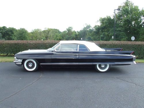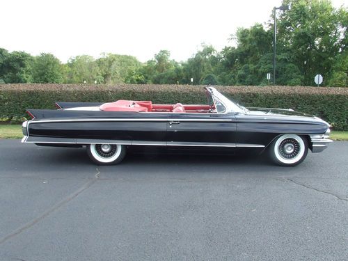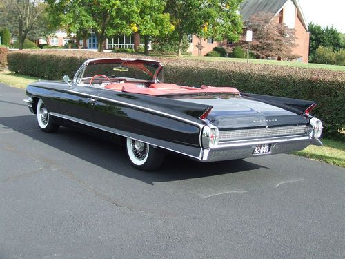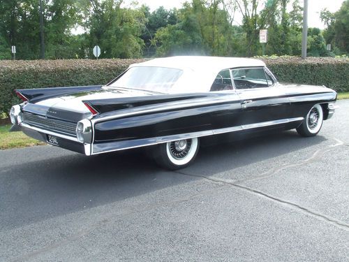 1962 Cadillac Eldorado Convertible, 74,626 miles. Black w/Red leather interior, White convertible top. New tires, wiper motor just rebuilt, New tune up. Car runs & drives great; was repainted the original color Black years ago & still looks good with only minor flaws. Power convertible top works fine & the top is in good condition. Leather interior is in very nice condition; the dash pad has some minor cracks. Chrome is straight & shines great. Under carriage was under coated years ago & appears to be solid. No air conditioning. Only 1,450 Eldorado Convertibles were built in 1962. Miles are believed to be original. This is an older restoration that still looks good, but not perfect. A very nice solid car. I am listing this car for a friend of mine who will be present @ the time of sale & is available to answer any questions. The car is available for pre-inspection. I do reserve the right to end the auction early. Any questions please call me @ 610.721.5944