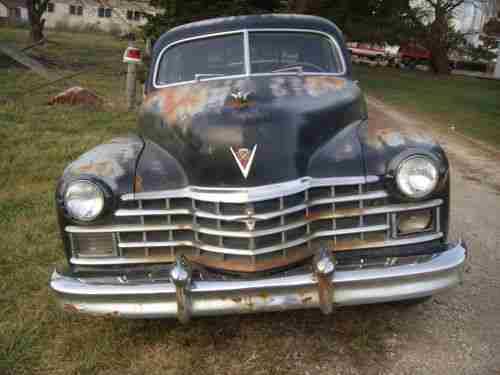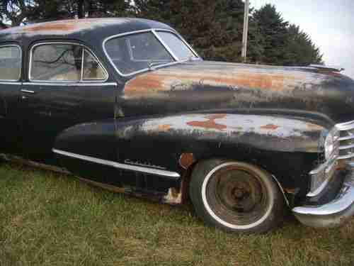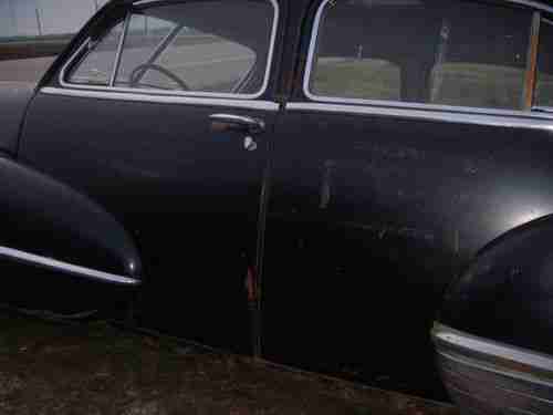 1947 CADILLAC FLEETWOOD SEDAN, ALL ORIGINAL CONDITION,V-8 AND 6 VOLT... A VERY RESTORABLE CAR, HAS ALMOST ALL THE PARTS AND PIECES, ONLY MISSING A FEW, THE MISSING PARTS THAT ARE NOT SEEN ARE IN BACK SEAT AND TRUNK.IT COMES WITH A STRONG FLATHEAD V-8 ENGINE RUNS GREAT NEEDS A MASTER CYLINDER, SO WILL NEED TO BE TRANSPORTED OR TOWED!