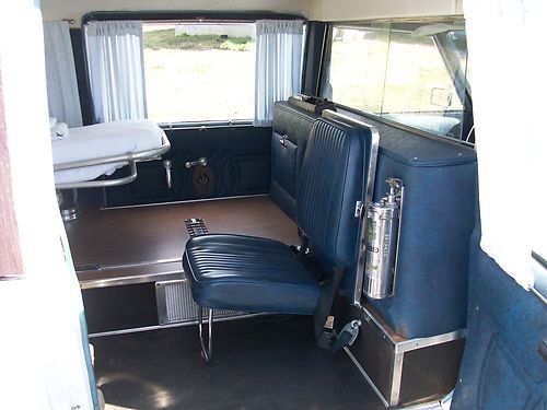 All functional parts still in back. Jump seats and belts are there. Comes with Landau Panels, Ambulance Plates for rear windows, cot (old Washington two man), and fire extinguisher. It has a small modern siren on it and still has all the controls for the lights, rear air/heat, rear dome lights, etc.. The Radio works but the antenna has quit in the down position and the air conditioner compressor has been wired to a toggle switch mounted under the dash and does blow cool air but will also need some TLC. All the Glass is good.