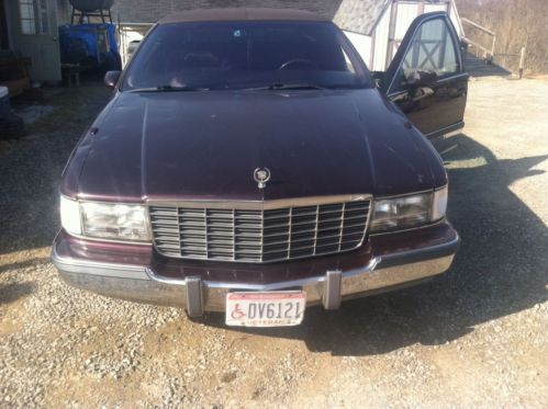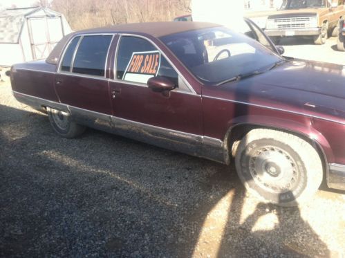 You are bidding on a 1994 Cadillac Fleetwood Brougham.This caddy has just over 128,000 miles on it and no rust. Four new all season radial tires.Dual exhaust 5.7 liter (350) Port fuel injected LT1 Engine. This thing runs awesome has all kinds of power. Has factory selectable rear locker switch is in glove box. AM/FM Cassette/CD with power antenna that sounds great. Seats are power everything and heated. My wifes uncle passed away two years ago and this thing has been sitting ever since. ABS ,Airbags, All glass is good condition. Some of the bad , one of the rear windows dont roll down, Transmission shifts hard from Low 2 to Drive. It never done this when it came here may need fluid and filter changed. Still driveable but irritating. Dash is cracked from sitting in sun. Hood is scuffed from a fiberglass cap that blew across it during a bad storm. Front oil seal seeps a little,easy change. Clearcoat is worn in places as shown in pics. This is a cheap ride for the money. Come drive it home. Had this listed before Lots of tire kickers,Hey can I make payments,do you wanna trade for yada yada yada, Please call me lets make a deal you know the ones who think there buying a 30,000$ car for 1500 bucks.This car is sold as is where is no warranties implied I dont have the time or inclination to work on it as I have way to many projects as it is.Someone needs a good cheap dependable car this is it. Come take it for a test drive. I'm in east Central Ohio inbetween Barnesville and Quaker City. READ THIS DESCRIPTION Car is 20 years old. low miles runs great. Will turn both rear tires even with traction control on. Its got Power. Local pickup only. No I wont ship it C.O.D. to California! Yes it was asked before! All lights work as they should. Has Level ride equiped (Irritating to me) Cruise Control, Climate Control,Power trunk. Key was lost when the Uncle passed away so we had to put an ignition switch in it which was a non VATS switch causing passkey light to be illuminated on dash. does not effect its driving. Hopefully I've thought of everything.Lots of paperwork was in glovebox showing several thousand dollars worth of Maintenance and repairs done over the years including a transmission rebuild to the tune of 3,000$ Has original glove box manual with it.