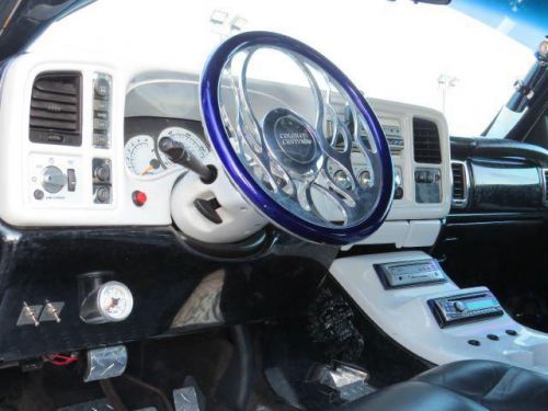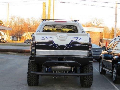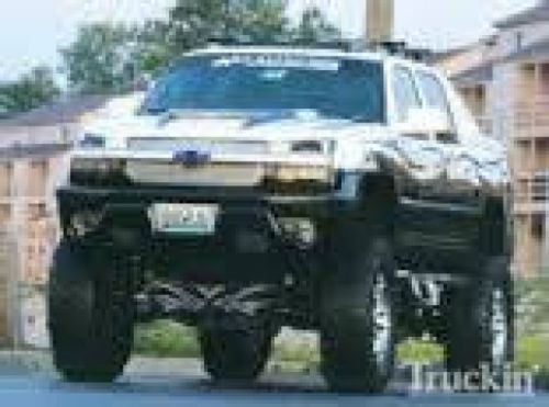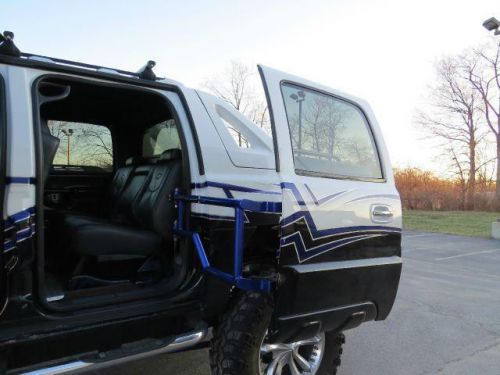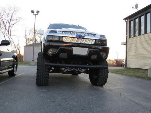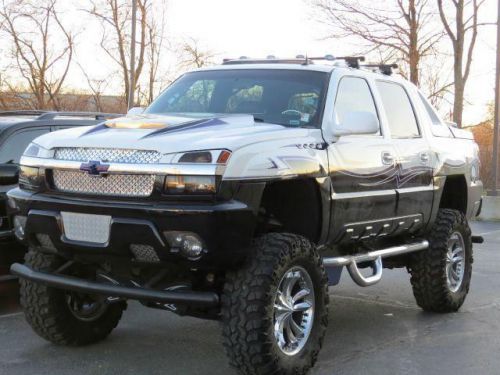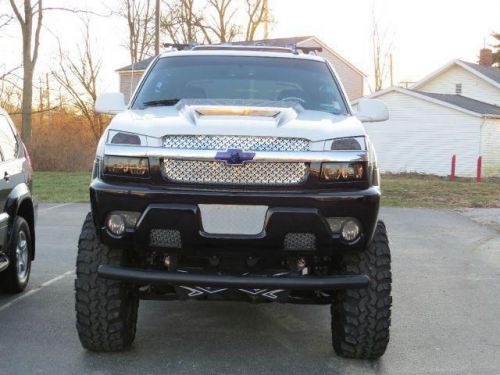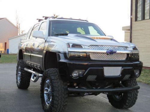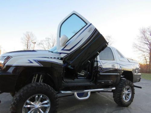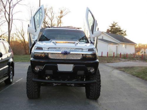 WOW!!! This is a one of a kind 2002 Chevrolet Avalanche *Custom*. Check out the list below of specs....... This is one awesome vehicle. Vehicle is very clean and is mechanically sound. If you have any questions please call 877-365-0531. Engine & Drivetrain: 5.3L Vortec V-8, ARB cold-air intake, Poweraid throttle body spacer, stainless steel braided hoses, Superchips Programer, Gibson cat back exhast, Escalade engine cover. Rims: 22x9.5 inch Jesse James .357 rims Tires: Interco 41x14.50R22LT Super Swamper Iroc Tires Suspension: (FRONT) Full Throttle 10 inch IFS kit, four Pro Comp Reservoir Shocks, Full Throttle dual shock hoops (REAR) Custom Full Armor four link,airbag mounts and shock mounts, Phoenix 18,000 Pound air springs, six Pro Comp reservoir shocks, Full Armor Sway Bar (ACCESSORIES) Viair 450c air compressor, 5 gallon stainless steel air tank, four 1/2 inch Air Lift valves (CHASSIS) Smoothed and painted frame *****Suspension work done by Full Armor Customs, in Springfield Missouri Body Modifications: Front Lambo Style Doors, Rear Cantilever Suicide Doors Custom Fabricated, Smoothed and painted body cladding, Goodmark ram induction hood, custom Chevy Bow Tie on grille, billet gas door, custom diamond-plate accents, smoothed and painted taillights, '06 Buick fender vents, custom made speed grilles, chrome step bars *****Body Mods done by Full Armor Customs, in Springfield Missouri Custom Paint: House of Kolor Summit White, Midnight Sapphire, Orion Silver, and Burple Candy Interior: Black Suede Headliner, diamond plate floor mats, and foot pedals, stock leather seats with alligator inserts, painted dash, door panels, and center console, Nu Image Diamond series gauge face, Faze gauges, hand carved skulls in center console, chrome Escalade interior door handles, Billet Specialties dash knobs and A/C vents, KP components air gauge ***** Interior done by Full Armor Customs and Ron's Custom Interior and Polishing Audio/Video: