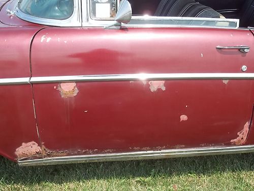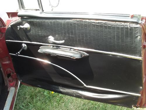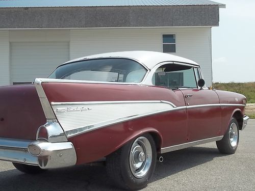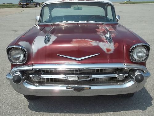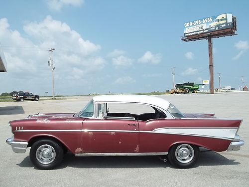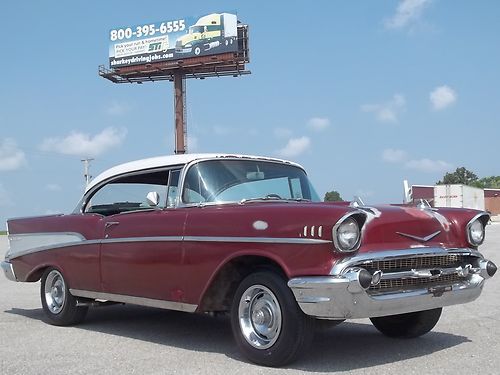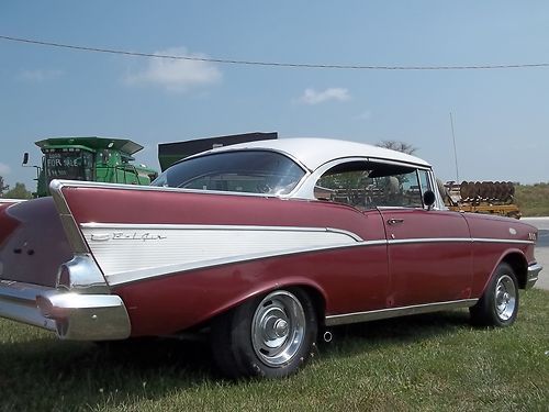 HERE IS A BARN FIND 1957 CHEVY BEL-AIR 2 DOOR HARDTOP. IT HAS A 327 V8 MOTOR WITH A 4 SPEED TRANSMISSION. THE CAR RUNS AND DRIVES GOOD! IT IS A VERY SOLID CAR WITH JUST A LITTLE RUST. THE FLOOR AND TRUNK ARE SOLID. THE CAR DOES HAVE 2 SMALL PATCH PANELS IN THE FLOOR. THE CAR IS COMPLETE AND HAS EVERYTHING ON IT. THE CAR SAT SINCE 1992 IN A BACK GARAGE/ BARN. THIS IS A CAR THAT YOU CAN ENJOY AND FIX UP AS YOU GO!!! ALL THE GLASS IS GOOD EXCEPT THE DRIVERS DOOR GLASS IS CRACKED. THE LIGHTS, WINDOWS AND GAS GAUGE ALL WORK. THE CAR HAS A NEW CARB AND BRAKES. THIS IS A GREAT CAR AND GETTING HARDER TO FIND. IF YOU HAVE ANY QUESTIONS PLEASE CALL 314 276 3124 THANKS ERIC.