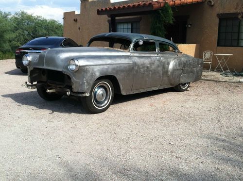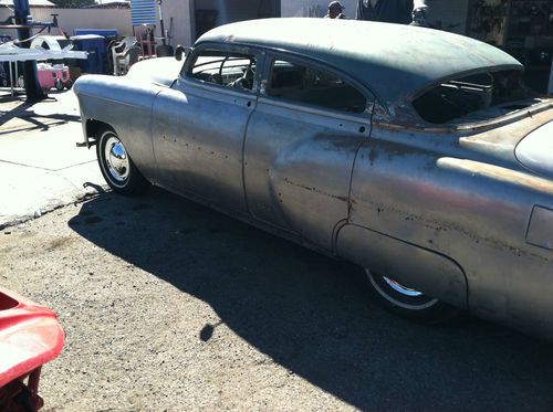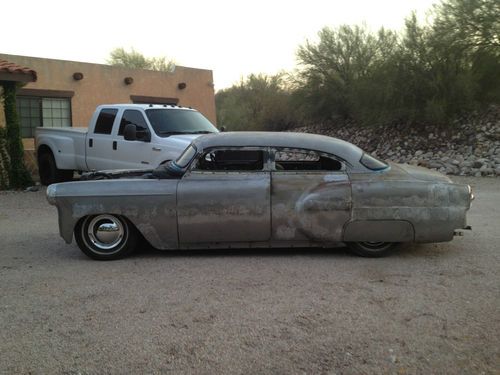 1953 Chevrolet 210 with a Chevy 350 V8 paired with a Turbo 350 (TH350) transmission. The car has been chopped 5 inches and has plexigass front and rear windows. The car has full air-ride suspension with 2500lb bags in the front and 2600lb bags in the rear. The entire car has been shaved and the gas tank filler neck now fills from the trunk. The head lights have been frenched and the entire car is bare metal and ready for body work. The car does have rust, but nothing that a normal classic project doesn't have. I have all the parts for the car, including a drivers side floor pan for whoever buys the car. The car runs and drives, but has carburetor tuning problems. I still have the original 235 inline 6 that I took out of the car. It seized and that's why the 350 V8 was put in. For any further questions, just email. The car has surface rust on it and is sold as is and the buyer is responsible for the pick up in Tucson, Arizona.