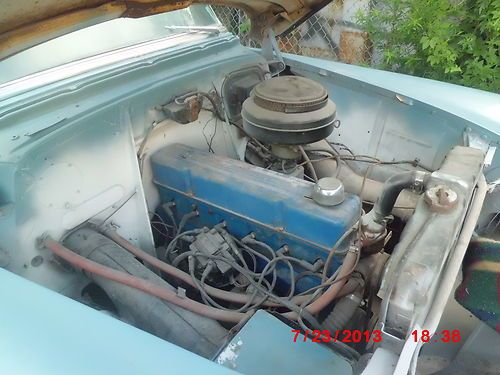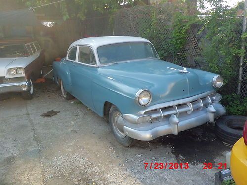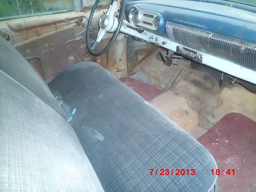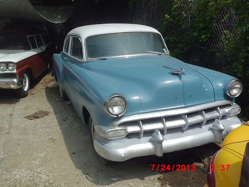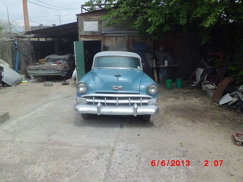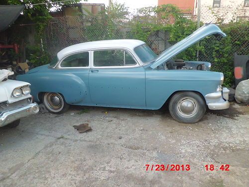 Up for auction is my 1954 Chevy 210 2 door. 235 6cyl engine, 3 speed standard, column shift, 28323 on speedometer. The engine has a 6 cyl electronic distributor installed in it & starts up & sounds great. Original am radio, dash is not cut up or butchered like a lot of these are. Good blue fabric seats. Seats were reupholstered a little while ago & still look good with no rips or tears. The car is painted two tone. White top & a light blue bottom. The first few pics is when the top was in grey primer but now the top is white as in the later pics. The paint was put on as a base coat to see where any scratches were or places that needed to be repaired were but it still looks good & could even be used as a daily driver in this condition. I have all the chrome side mouldings in the trunk of the car & most times the mouldings are the hardest pieces to find but i have them all & they are in good condition. It recently had a new water installed on it, new fan belt. new radiator hoses ,new clutch, pressure plate, new throw out bearing & new battery tray. It has all 4 -15 inch white wall tires & 2- blackwall spare tires. All the tires on the car & good & hold air. G78-15 It has all 4 chrome baby moon (dog dish) hubcaps with the chrome trims. It has a chrome gas door guard. These cars are getting harder & harder to find, especially the 2 door ones in good condition with all of the parts. I have had the car for years & had no intensions of selling it, but one of my other cars had a rip in the front bench seat & i wanted to get just the front seat repaired but they said that it wouldnt match with the back seats afterwards so I would have to get the front & back seats on my other car reupholstered. Wholly Batman ! ! ! ! ! I wanted the seats reupholstered, not brand new seats. The price that they wanted to do the seats is more than i had wanted for the 54, so I have to sell the 54 to be able to pay to get the seats done in my other car. The seas in the 54 are already done, so that alone plus all of the mouldings is well worth more than the price of the 54 chevy. Now the bad which is not really that bad. The headliner is there but it is dirty & has 2 rips in it. Both the drivers side door glass & drivers side rear glass have cracks in them but they both still roll up & down properly. The front widshield, back windshield & both passenger side glasses are all good. There is a hole in the passenger side front floor, small holes in the pass side rear floor & a home made patch on the drivers side front floor but i had bought all 3 pieces brand new & still have them in a box in the trunk. It has a brand new clutch, pressure plate & throw out bearing installed in it but the transmission does not engage. I dont know if the linkages are hooked up wrong or if the clutch was installed backwards but in any case, the clutch does not engage so the car does not move. There are no papers for the car. I will give you a signed notorized Bill of sale from me. The listing reads clear but there is no option for no title so it is being sold with a bill of sale only. It would make an excellent parts car or great hot rod or winter project. If in the Bronx area, you are more than welcome to come by & bring your mechanic to look over the car. Please ask any & all questions as soon as possible to give me time to get back to you. I will not answer any questions on the last day of the auction or after the auction is over. If you have less than 10 positive feedbacks, then please contact me before you bid on my item, otherwise, I will cancel your bid, block you from all of my future auctions & notify ebay on you. There is a 100.00 dollar pay pal deposit due within 24 hours after the auction end, no exceptions. The deposit must be paid before the car is picked up. The balance must be paid within 7 days of the auctions end. If you cant pay the deposit then i will notify ebay on you & relist the item. I read the book " computers for dummies" & could not figure it out, but i was still able to set up a pay pal account & able to pay deposits & send money online, so if I can do it, so can you. You can pick up the car anytime after the funds have cleared. If you need more time to pick up the car, then i can give you some extra time to pick it up but, if after 30 days after the clearance of your funds, then I will have to charge you storage. Shipping is the sole responsibility of the winning bidder. I will assist with loading of the vehicle onto your trailer or flatbed. I reserve the right to end this auction at any time as the car is also for sale here locally in the bronx. I have too many cars, & not enough time or money to fix them all. Please check back as I may be listing a 62 impala 4 dr & a 64 impala 4 dr .