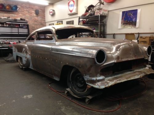 chopped 1954 chevy project. this car was started by my buddy at count customs in las vegas. chop is about 75% complete. car comes as you see it. ask questions please. there is a 350/350 that will go with it i know nothing about. chassis was built by sosa metal works in vegas. set up for bags which are not included. 4 link rear with a cadillac disc brake rear. rear is 2" narrower than stock for clearance with wheel skirts. front is set up for mustang rack and uses s10 spindles and brakes. there are a couple of rear window surrounds that will be included with car. we have 3 chops in shop at this time and not enough room for all of them. customer work has to come first at this point. thanks, glen. 802_375_5751