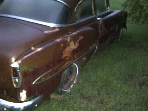1954 Chevy Belair 2 door sedan. ROUGH but build-able. The seats frames are in the car but the floors are in very poor shape. The trunk is solid. It has ding and dents and was last registered in the 1980's out of Texas. I have extra chrome parts that will go with it. Excellent rat rod!!!! Bill of sale!!!