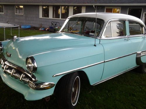 THis vechile is being sold as is. you must pick up no shipping is available. This 1954 Belair is a 4 door, it has a new camaero rear end. New flow master exshuast, new turbo tranny. its ready for your small block motor. Car also has new brakes, and old wheels that are ready for you to pick out new ones. This is a straight vechile, The car is put together. just ready for your final touches. We can provide basic information for the lost title at the DMV, and names. please feel free to email me at christ.mccormick@yahoo.com