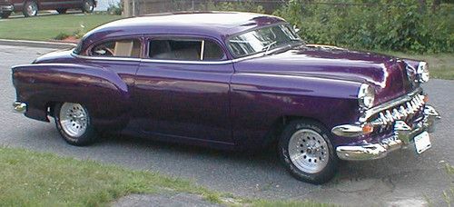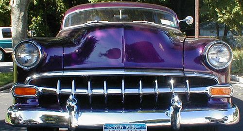 1954 CHEVY 150/210 WITH 5 1/2" CHOPPED ROOF, 350 V8 4 Bolt main bored .040 over, hugger headers and cherry bomb dual exhaust, Aluminum Holly manifold 4 Barrell Holley 600 Carb. 350 Turbo automatic tranny with Lokar shifter, Nova 10 Bolt rear, lowered 3", New front custom cross member with Mustang power rack front end, so it has power streering and power brakes! Moog Springs, with Chevy 5 bolt lug pattern from "RB OBSOLETE",