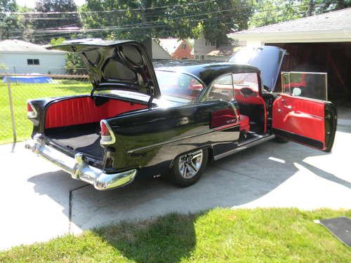 UP FOR AUCTION TO THE HIGHEST BIDDER IS THIS AWESOME 1955 BEL AIR 2 DOOR HARDTOP TREATED TO A METICULOUS NO EXPENSE SPARED PICTURE DOCUMENTED 2 YEAR FRAME OFF NUT AND BOLT ROTISSERIE RESTORATION WITH RECEIPTS.. STARTING WITH A RUST FREE ALL ORIGINAL FLORIDA CAR !! THIS ORIGINAL BODY PANEL 55 CHEVY SHOW CAR WAS FEATURED IN CLASSIC CHEVY WORLD MAGAZINE AND TAKING SEVERAL 1ST PLACE TROPHIES.. ENGINE IS A 502CI 502 HP+..EDELBROCK POLISHED AIR GAP INTAKE..HOLLY 770 CFM CARB...COMP CUSTOM GRIND CAM...MSD ETC..RICHMOND 6 SPEED TRANS...BE COOL RADIATOR...VINTAGE AIR...CLASIC CUSTOM INSTRUMENT GAUGES...ALL WHEEL DISK BRAKES...3.73 POSI REAR...CUSTON HEADMAN JET COATED HEADERS...COMPLETELY CUSTON INTERIOR AND TRUNK...FRONT AND REAR SWAY BARS...FATMAN POWDER COATED A ARMS...4" ALUMINUM DRIVESHAFT...LED TAIL LIGHTS...CUSTOM IROC CHROME WHEELS WITH 502 EMBLEMS...THIS CAR IS IN EXCELLENT CONDITION THE BODY IS AS STRAIGHT AS CAN BE AND THE CHROME, PAINT, AND FIT IS SHOW QUALITY!! ...THIS CAR IS OWNED BY A METICULOUS COLLECTOR AND THE CAR IS KEPT IN HEATED STORAGE AND HAS NEVER SEEN WEATHER!! ..ALL THIS AND SELLING WITHOUT RESERVE!!! FOR MORE INFO OR TO SET UP AN INSPECTION FEEL FREE TO CALL ANDY 248 672 6663