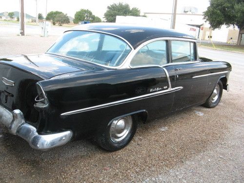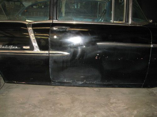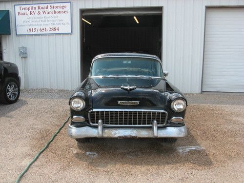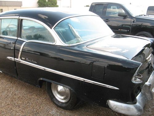 THIS IS AN ORIGINAL 1955 BEL AIR POST , HAS HAD A COLOR CHANGE' TO BLACK'' BACK IN THE EIGHTIES' THE BEL AIR WAS FACTORY 'PNT CODE 602' INDIANA IVORY AND SKYLINE BLUE' IT'S MATCHING NUMBERS' AND COMES FROM AN I OWNER FAMILY' THE BEL AIR HAS BEEN STORED FOR THE LAST 15 YEARS' OTHER THAT THE PAINT CHANGE, EVERYTHING ON THE CAR IS IT LEFT THE FACTORY, WHEN I BOUGHT IT' HERE WHATS BEEN DONE' PRESTART MAINTANCE PERFORMED'' AND MINOR TUNE UP' THE BEL AIR FIRED RIGHT UP' FROM A FUEL CANISTER, JUST AMAZING HOW GOOD IT SOUNDS, THE FUEL TANK NEEDED REPLACED, SO ONES ON THE WAY,THE TAIL LIGHT LENSES WERE WORN SO NEW ONES ARE ON THE WAY ALSO, I PUT A GOOD SET OR TIRES ON, I DROVE THE CAR WITH THE CANISTER, TRANS SHIFTS SMOOTH AND NO REAR END NOISE' THE INSIDE, THE TOP HALF OF THE BACK SEAT WAS WORN AND TORN' SO IT'S BEEN REMOVED, AND BEING REPAIRED' THE ORIGINAL FLOORING MATERIAL IS STILL IN PLACE, NEVER BEEN REMOVED, THE FLOORS TRUNK' AS AS GOOD AS YOU WILL FIND' SOLID REALLY' THE DRIVERS DOOR PANEL HAD BEEN REMOVED' ITS BEING REPAIRED ALSO' THE DOOR HANDLE WAS GUM UP I FOUND OUT WHEN REMOVED JUST NEEDED A GOOD CLEANING' THE BODY ON THE BEL AIR IS NICE ALMOST RUST FREE' I RAN A MAGNET ALL OVER THE CAR' THE PASS DOOR DOWN LOW HAS SOME FILLER AT THE BOTTUM' JUST DINGS FROM WHAT I SEE'' THE FENDERS AT THE HEAD LIGHTS NEED SOME WORK, SEE PIC'S IT'A ALL THERE' THIS IS A VERY SOLID 1955 BEL AIR POST' MATCHING NUMBERS AND A 1 OWNER FAMILY' A SOLID DRIVER AS IS' I HAD PLANS TO RESTORE THE CAR' AND TAKE IT BACK TO THE ORIGINAL COLOR' AND MAKE IT BRING THE BIG DOLLARS, BUT I HAVE TO MANY FRAME OFFS GOING ON NOW' FOR THE RIGHT MONEY SOMEONE CAN OWN THIS RARE OLD BEL AIR' AND I WILL ADD A BUY IT NOW PRICE'' FOR THE RIGHT BUYER' THE CAR IS FOR SALE LOCAL SO I RESERVE THE RIGHT TO END THE AUCTION EARLY' THANKS AND GOOD LUCK