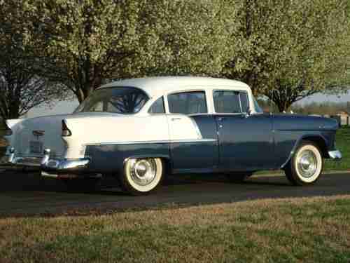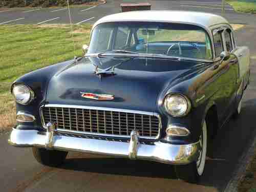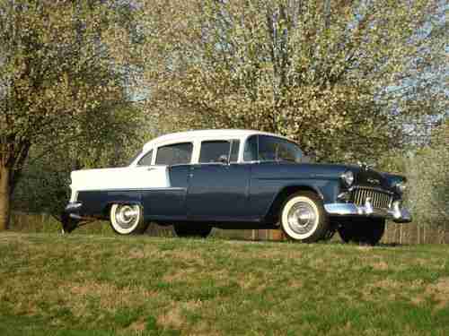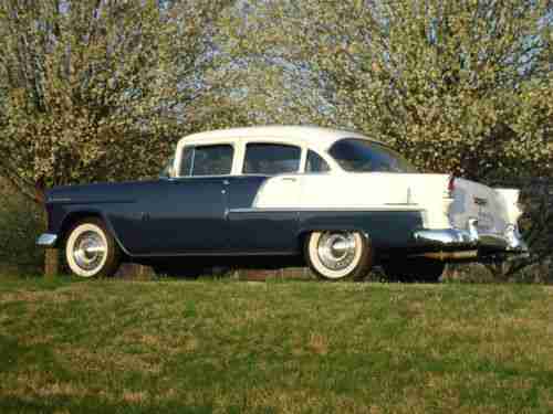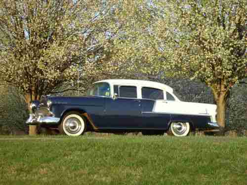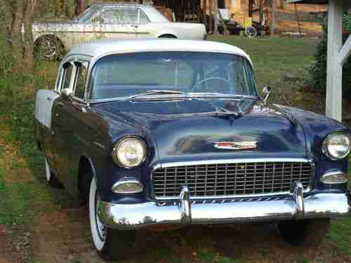 1955 Chevrolet 210 Four Door . I Drive her 40+ miles every day. Car was restored to be driven . The paint is very shiny and looks great , but its not a show car has some small waving here and there . The back door on the drivers side has a small area at the bottom that is starting to bubble ,about the size of a nickel . The Passengers front floor has been patched with sheet metal . The bumpers have been rechormed , the hood ornament is new or rechromed , the chevrolet hood emblem is new , The glass is new with tint inside the glass , the trunk lid emblem is new . The car has aftermarket air with a electric fan . All of the interior trim has been painted and looks awesome , the interior is a 9+ out of 10 . The outside trim has all been polished . The car also has wide whitewalls and super nice caps . The Vin # is B55A005047 which states its a 6cyl but it has a very early small block 265? 283? 327? If you have any idea let me know . It does not have the modern oil filter , its the canister type , and dip stick on the block . I know Ive left out volumes but just call my cell @ 828-448-5223 to clear any questions you may have up . This is a great car that has to be driven daily , she just has to . I thank you for looking . I reserve the right to end this auction at anytime . If you dont have any feedback , I understand but you must contact me first . If you have any questions about the car or shipping or anything else please contact me before bidding . The car is as is . I suggest that you see anycar in person before bidding . If you cant come i sugest you use a third party . I hear that i company called lemon squad is really good . and if you buy the car i will split the cost with you . I thank you very much for looking . GOOD LUCK !!