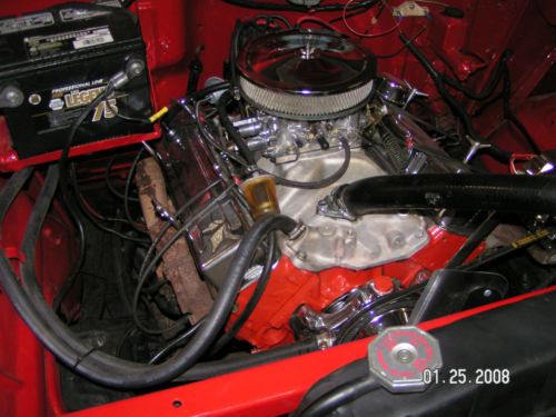 350 Engine with some modifications, Performer Intake, Edelbrock Carb, Mild Cam, Ceramic Headers and finished off with a Chrome dress up kit powering a 350 Turbo Transmission.