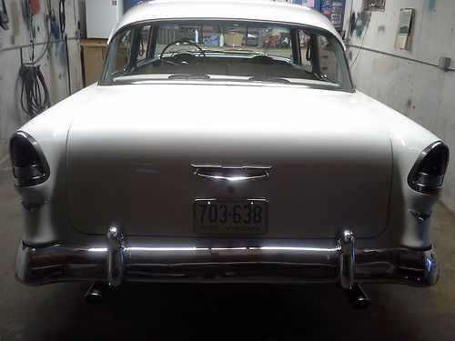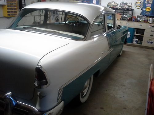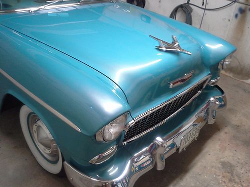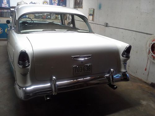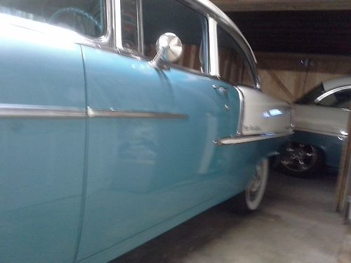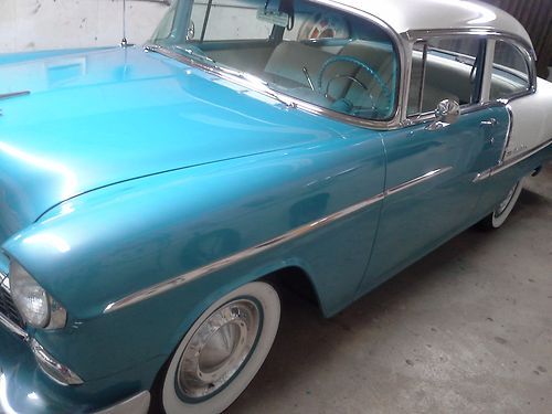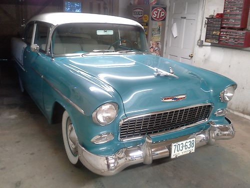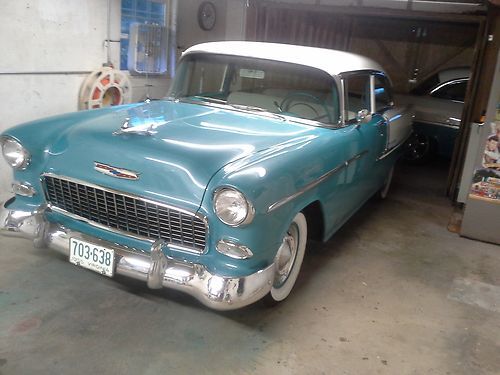 FOR SALE 1955 CHEVY BELAIR 2 DOOR SEDAN.265 V-8 WITH 2 SPEED POWERGLIDE.THIS CAR IS A OLDER RESTORATION THAT WAS DONE IN THE EARLY 80'S.IT WAS RECENTLY FRESHENED UP.WITH LOTS OF NEW ITEMS WHICH INCLUDE THE FOLLOWING.RADIATOR,FAN SHROUD,ORIGINAL STYLE TEMP GAUGE,WATER PUMP,REBUILD ORIGINAL POWER STEERING,ALL NEW FRONT SUSPENSION INCLUDING BALL JOINTS,TIE RODS,A-ARM BUSHINGS,AND ADD A NEW SWAY BAR,REBUILT REAR END AXLE BEARINGS AND ALL 3RD MEMBER BEARINGS AND SEALS,ALL NEW BRAKES SHOES AND CYLINDERS,AFB CARB, INTAKE,AIR CLEANER,HEI DISTRIBUTOR,WIPER MOTOR AND ARMS,ENGINE AND TRANS MOUNTS,NEW EXHAUST SYSTEM,RAD HOSES AND BELTS,GOODYEAR RADIAL WIDE WHITE WALL TIRES.RADIO AND SPEAKERS,AND STARTER.SWEET LITTLE CAR THAT RUNS AS SMOOTH AS A WATCH.NO SHAKES OR RATTLES,CAR HAS THE ORIGINAL COLORS TURQUISE AND WHITE.HAS NO RUST ISSUES.UNDERNEATH SHOWS NO WORK NEEDED.ALL BRACES AND PANS ARE RUST FREE.CALL ALLEN @ 540-493-6759 WITH QUESTIONS.
