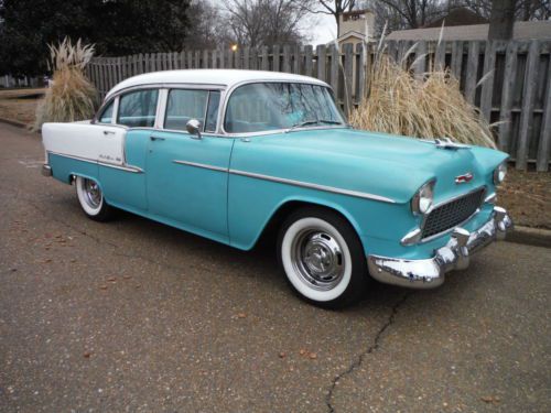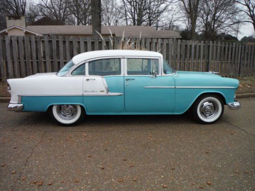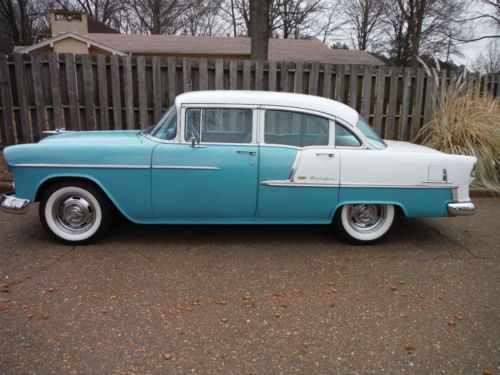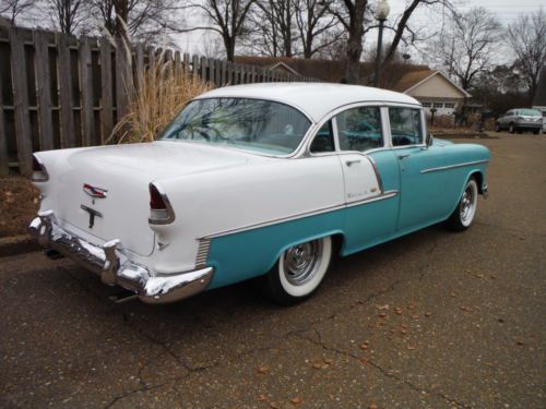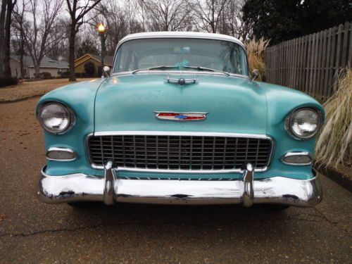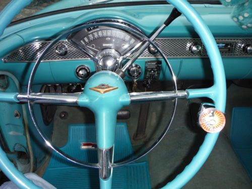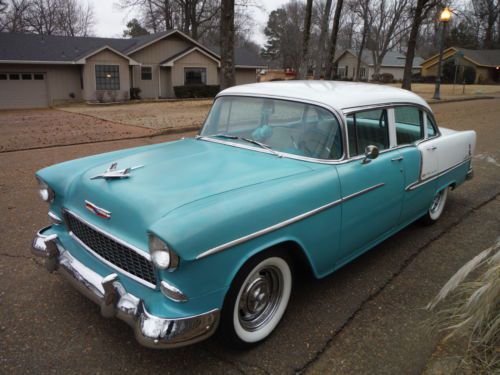 1955 Chevrolet Belair Pro Touring Car Low Miles This is a low mileage classic has 73,181 actual miles to be exact. It has a beautiful color combo. It is regal turquoise and white on the exterior as well as the interior. The interior is all original and is decent for its age. The stereo was replaced with a factory looking one and it has an electric antenna. This 55 has had some upgrades, such as a very nice built high performance 350 V-8 with hooker headers, aluminum intake, edelbrock 4 barrel carb., electronic distributor, no points to worry about. Full dual exhaust to the rear, sounds great! Great powerful engine, not cammed or loping, just smooth power with a low rumble. It also sports a 700r4 transmission with overdrive for nice interstate driving and a power disc brake conversion that stops the car on a dime. It handles like a late model car with no rattles. Also has an after market gear indicator with overdrive that sports the factory look (as seen in pics). Thousands have been spent to make this jewel perform like a late model car. This is Not your average 55 Chevy! The underside is solid, floors, mounts, rockers... The white is nice and the turquoise is a little faded but gives it a cool original classic look. When you drive this classic you will fall in love with it. It is peppy and smooth, very impressive, as you would want. Bid with confidence! Call Paul for any questions 901-489-0763 |