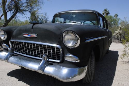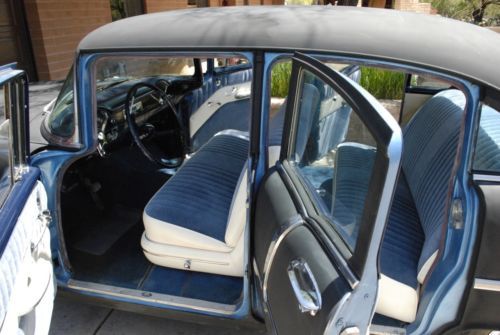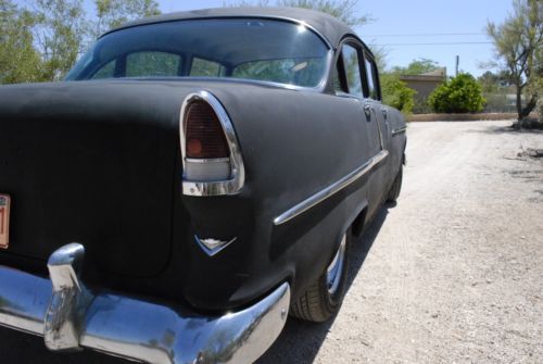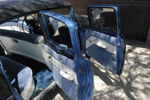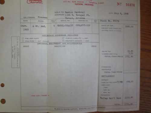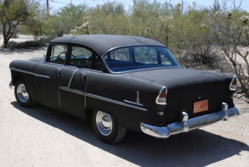1955 Chevrolet 4-door Bel Air factory V-8 car. This car was purchased new in Tucson AZ. and has been here ever since. There is NO rust. There is an accident free car. This is a really straight car that can be enjoyed they way it is or would be a fantastic start for a restoration. It came with a 265 V-8 from the factory but now has a 327 V-8 and Turbo 350 transmission from a 69 Camaro. Engine is strong with no leaks, only needs a little love before an out of state drive. It has been sitting for ten years and only recently started and driven again. Transmission does not leak and shifts fine. Doors shut and latch nice, so does the trunk and hood. All trim is there, except rear Chevy emblem. All original glass, no cracks but two rock stars in front windshield. Interior is ten years old with no use in that time. Please call with any question, 520 603 0753 |