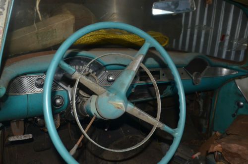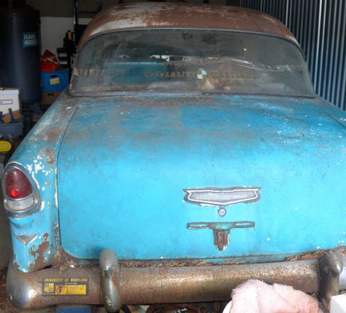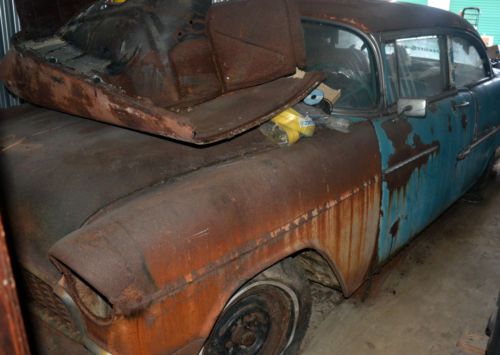 1955 Chevy 2 door Bel Air, rusted badly underneath. Has a 327 cu. in. motor that has not been started in 30 years. No transmission but set up for manual. All original metal, outside body not in to bad a shape. Includes extra set of front fenders and grill. No clue as to exact mileage.