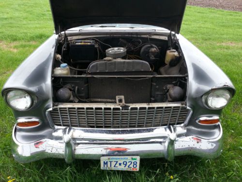 This '55 Chevy has very smooth, straight body panels and the chrome is in great shape. The small block 350 and 3-speed automatic run smoothly as well - 17k miles on rebuilt engine. You could drive it home today (but it would take a little work if you want to patch it up and make it a daily driver).