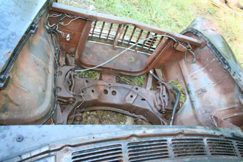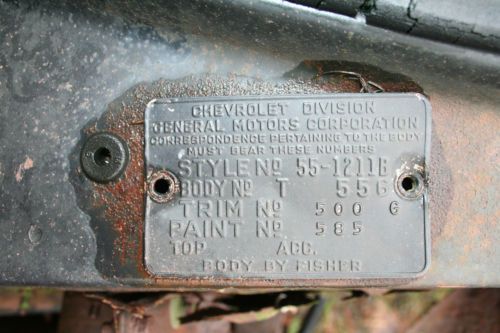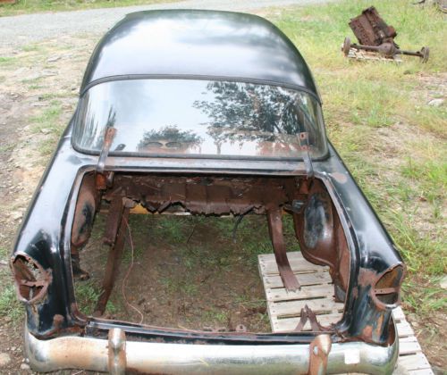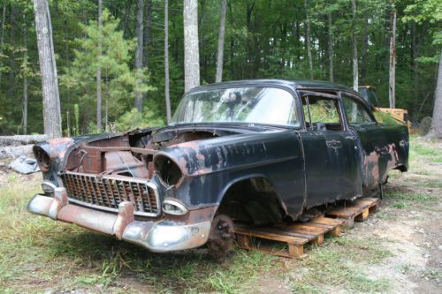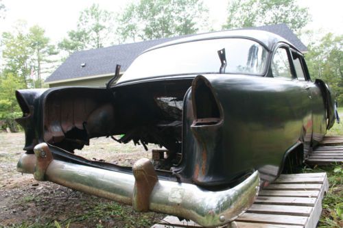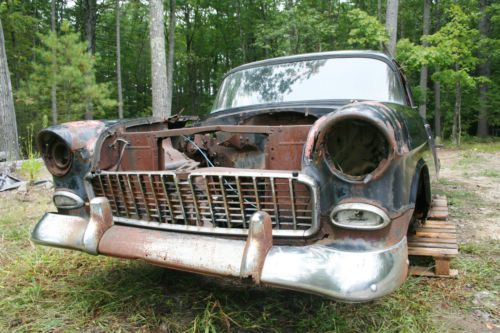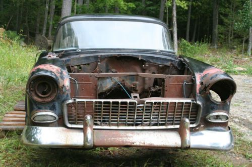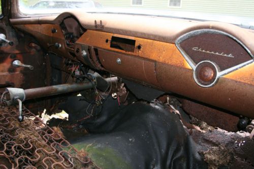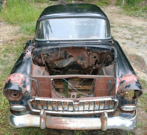 This is a 1955 2 door Chevy sedan. The pictures are explicit and what you see is exactly what you would be buying. Its redeeming value lies in the following assets: It has both a front and rear windshield in perfect condition, front and rear bumpers, two rear seat side windows with no blemishes, rear axle, I believe the original motor, (that was taken out to move the car), a steering column with a partial shifting unit, the front grill, the dash board, the front and rear seat framework and many other small parts i.e. door handles knobs, etc. The top of the body is very solid but the bottom of the chassis has rusted along with back of the frame. There is no transmission, no hood and no trunk. This car has a solid front end, good front wheel wells and a very workable interior. The motor looks to be in reasonable condition but it will need to be rebuilt due to an compromised valve cover.