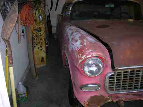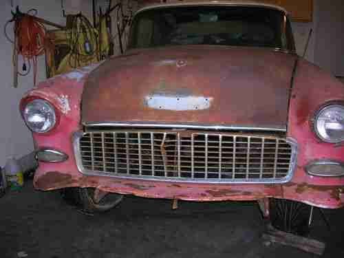 1955 Chevy Bel Air Hardtop 2 door. This car is in raw condition ready to be fixed. Interior & trunk floor in excellent condition. There is no engine, transmission or front seat. As with any car this old, there is rust in places. Rear drivers quarter panel, drivers door, etc. Has numerous extra parts that are included. Please do not bid unless you really want this car. Car has been garaged last 3 years. Clear Missouri title.