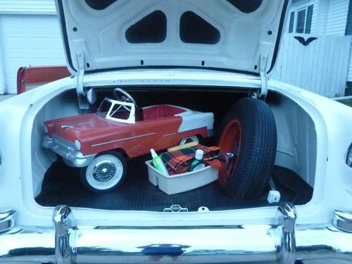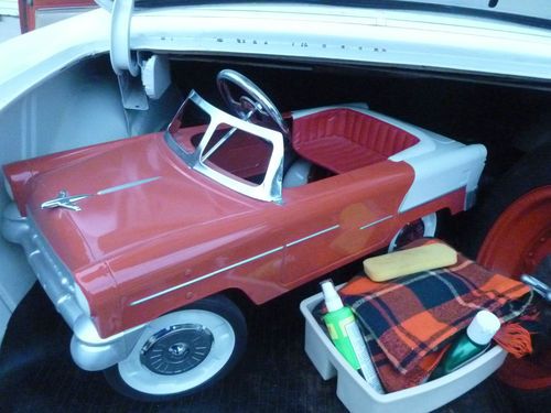 This is an 1955 Chevy Belair 2 door hardtop. Gypsey Red/Indian Ivory interior is red and white. Original 265 motor automatic, edelbrack 4 bbl, dual exhaust. Many buyer/dealer options- bumper gaurds. Electric mirrors, 67,000 original miles. Owned 12 years, prior owner Marylyn Miler. No plastic, Interior/exterior are Excellent. Tires are excellent matching original hubcaps. There is a matching pedal car in the trunk (bouns) mathcing spare w/jack. 75% restored