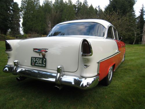 1955 Chevy Belair 2 door sedan. We have owned this car for 12 years and have had lots of trouble free fun with it. It runs and drives great, it is a very sharp looking vehicle that draws a lot of attention. There are a few imperfections, chips & bubbles in the paint from the elements of driving. Over the time that we have owned it, we have done a lot of upgrades including: Laminated tinted side glass, new windshield, all new dash trim, shoulder harness seat belts great for safety and for kids car seats, power brakes with front disc, front drop spindles and springs, rear 3" lowering blocks, Billet Specialties hustler 17" rims with Michelin Pilot Sport tires, this car has an incredible stance which sets it apart from most others, power steering with 605 box, new Holly carburetor, new radiator, completely re-wired the vehicle for dependability, rebuilt rear-end, the radio is Custom Autosound AM/FM cassette made to fit the original dash (no hacking). Car was rebuilt in 1992 with interior which is still in good shape (see pictures). Engine is a 327 which was rebuilt in 1992 and runs very strong and is approximately 330 horsepower. Transmission is a turbo 350, rebuilt in 1992 with a shift kit and drives good. The paint and body where professionally re-done in 1992 by Dave Mathison Street Rods and Customs and still look sharp today. We have had lots of fun with this vehicle of the many years that we have owned it, but it is time to let someone else enjoy it.