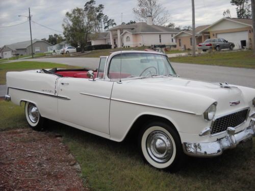 UP FOR SALE IS MY 1955 CHEVY BELAIR CONVERTIBLE, CAR HAS ITS ORG. 265 V8 WITH ITS 2 SPD P/G TRANS. . SHE RUNS AND DRIVES AND SHIFTS GREAT, THIS CAR WAS RESTORED 35 YRS AGO AND OWNER BEFORE ME HAD IT FOR 33 YRS , PEOPLE CAN NOT BELEIVE THE CONDITION ITS IN AFTER ALL THESE YEARS. THE INTR. WAS REDONE OVER 7 YRS AGO AND LOOKS LIKE NEW , IT HAS ALWAYS BEEN GARAGED AND COVERED, THE CONVERTIBLE TOP WAS REPLACED AT TIME OF RESTO AND IS IN PERFECT CONDITION AND THE TOP MOTOR AND PISTONS AND LINES ARE NEW. THE UNDERSIDE IS IN GREAT CONDITION NOT MUCH WAS DONE JUST THE TRUNK FLOOR AREA FROM WHAT I SEE , ALL THE FENDERS, DOORS, QRTS, LOOK TO BE ORG.. THE ENTIRE BRAKE SYSTEM WAS ALL REDONE ALSO NEW WIDE WHITES WITH LESS THAN 1000 MILES ON THEM.CAR ALSO HAS HAD NEW WIRING DONE , I ALSO HAVE A SET OF STAINLEES STEEL SHIRTS FOR HER. ANY MORE INFO FEEL FREE TO GIVE ME A CALL 352-777-1943. TOM. P.S. CAR IS FOR SALE LOCALEYAND I HAVE THE RIGHT TO END AUCTION EARLY