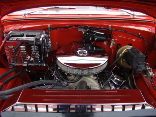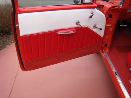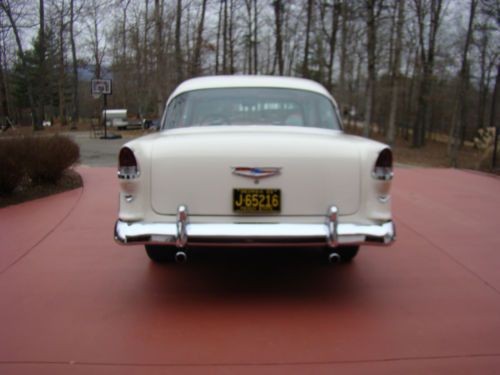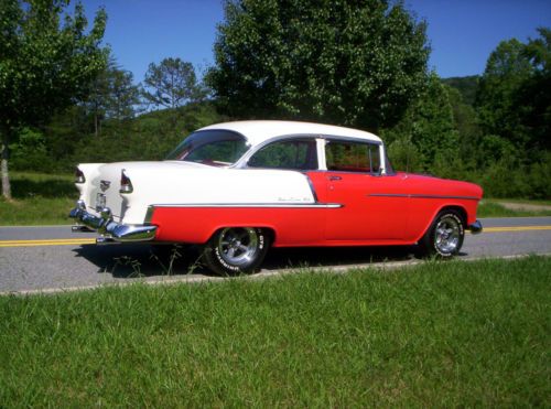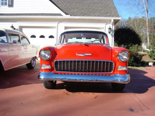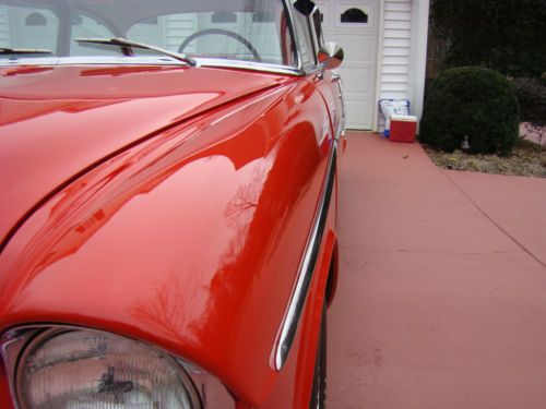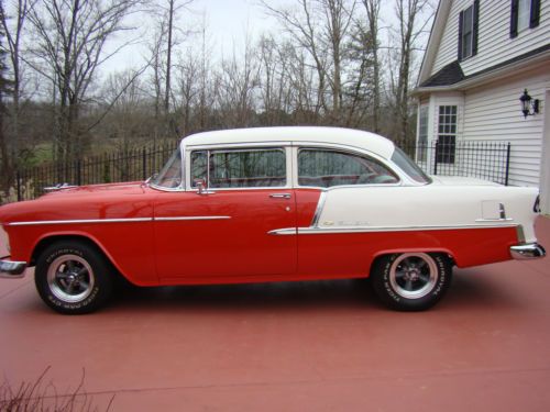 Red/White exterior paint with Red/White interior All glass is new and stainless polished All guages,lights, and safety epuipment works New meaning car was a frame off restoration 2 years ago always garage kept New tires on old stlye american tork thurst wheels 15x7 350 bored 40 over with mun. 4 speed and orginial 55 rear end posi traction Power disc brakes front and drums on rear All bushing on front end and under body are new A very straight 55 car can be driven anywhere. If have questions call 7 7 O -- 8 9 3 -- 9 8 5 FOUR |