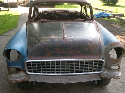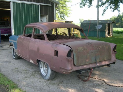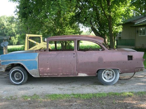1955 chevy two door post rolling chassis with good clear Iowa title.Nice main floor pans,very good inner rockers,body and frame mounts have been replaced.It has a California one peace frame that was all redune a few years ago but never finished.I have the trim for the out side tail lights,grill very fixable front fenders and hood,some rust in the trunk,dash cluster and steering wheel, 15x8 corvette ralley wheels and ralley wheels on the front. Please call me 24/7 at 319-310-4155 and check out my other adds