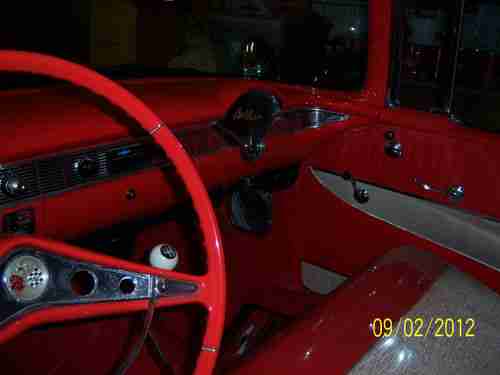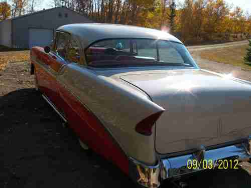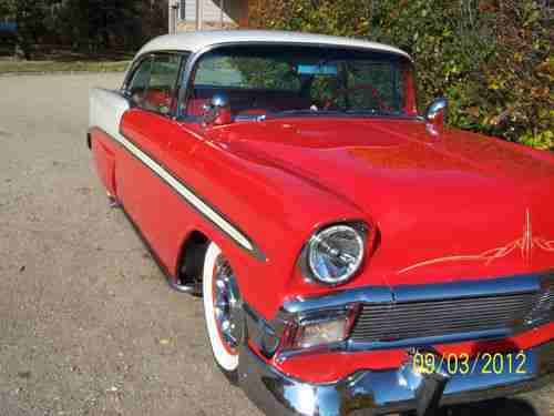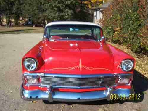 Very nice 56 mild kustom, car drives,handles, and rides good, with new rebuilt front suspention, new ball joints, springs, new power rack/pinion,new dropped spindles,disc brakes, new www radials. good running small block and good shifting muncie m21. Nice body, with shaved hood trunk and doors. super nice pin striping. body is nice under the bubble skirts, few inperfections in the body nothing serious. Has new vintage air heat and defrost.also air ride technology bags in the rear. Interior is like new with clear seat covers nice 59 impala wheel, am/fm cassett. power ant. front suspention, tires, vintage air have less than 100 miles. call me at 701 263 4897 I reserve the right to end the auction early.