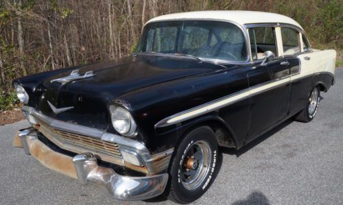 This is a 1956 Chevrolet four door sedan. This car has been my daily driver for fifteen years. It has a 265 cubic inch engine with a stock four barrel carburetor. Stamped onto the side of the block are 06I5366F56FB. It has a cast iron power glide transmission. Stamped onto the bottom are several sets of numbers....G266 or 0266....8718243 GM-4..............3708134 GM13 026. It has a vacuum wiper motor. All the lights work, as does the horn. Everything is factory stock and works. The only update to the car has been the installation of an alternator versus the generator. The car runs great and stops even better. The only problem is the transmission shifting out of first gear. However, as soon as it warms up, about one or two miles, it shifts normal. It has done this since I bought it. Glass: All OK but the left rear window is cracked and the passengers side front is also cracked but not broken. The reason I am selling this car is because of the rust. This car is a rust bucket. The rocker panels are mostly gone. Around the rear window on the drivers side bottom is mostly gone. This car needs trunk floor, quarter panels, front fenders, and a lot of other sheet metal. The frame is good and the car has never been hit. If you are looking for stainless trim its all here and straight. There are two one inch pieces that I cant find. Fairly new gas tank and lines. This car hauls, fun to drive. It has dual exhaust. Its fairly quiet til you jump on it. You can drive this car home, no need for a trailer. The title is a clear Maryland title. On the front pad of the engine is stamped 06I5366F56FB. This is a 265 cubic inch single four barrel small block V8. According to motors manual it has 205 horsepower. The VIN number is 76237081028 A five hundred dollar deposit is required within three days and car must be picked up and paid for within 30 days. Any questions please call 410-600-5037. |