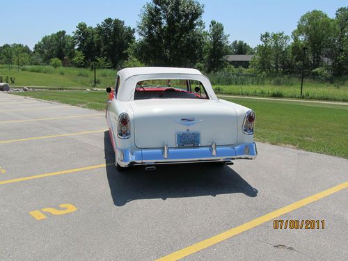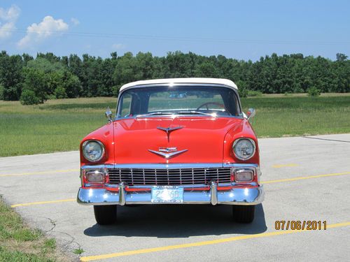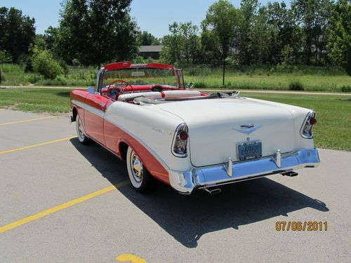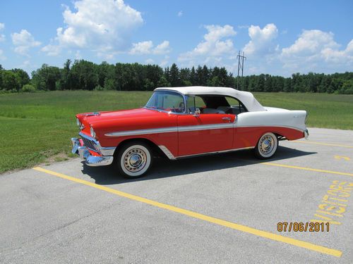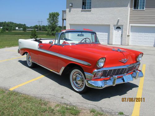 1956 Chev Belair convertible, correct Matador Red and India White exterior, correct Red and White interior. Power Steering, Power Top. I have owned this car since Sept 2001. Body was restored just before I purchased it. I have replaced the following; power steering cylinder and the rams, pump and motor for the top. Also upper and lower ball joints, tie rod ends and front coil springs.I have also replaced the front wheel bearings with tapered roller bearings and newer hubs. Tires are American Classic's WWW from Lucas Tire Co. new in May of 2009 and have about 10,000 miles on them. All glass is good as is the top. All gauges work except for heat gauge, a separate heat gauge was installed. Handles great on the highway and gets great mileage. extra parts include; used 265 engine stamped March 1956, this is not from this car, 1957 power glide transmission that was in the car when purchased, fender skirts that are new, but never painted,and other misc. parts. Seller may be contacted at 920 327-0449 or email berdon1@att.net