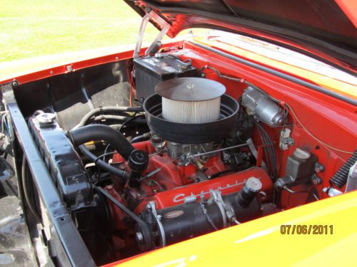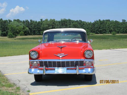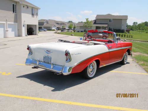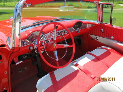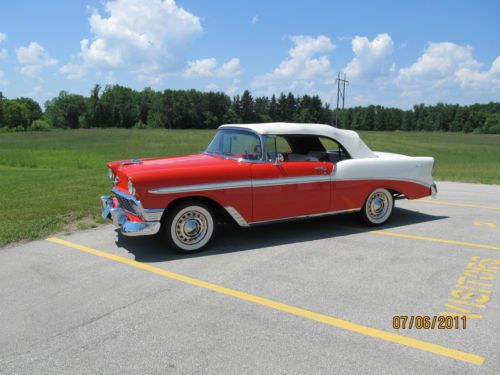 1956 Chev Belair convertible, correct Matador Red and India White exterior, correct Red and White interior. Power Steering, Power Top. I have owned this car since Sept 2001. Body was restored just before I purchased it. I have replaced the following; power steering cylinder and the rams, pump and motor for the top. Also upper and lower ball joints, tie rod ends and front coil springs.I have also replaced the front wheel bearings with tapered roller bearings and newer hubs. Tires are American Classic's WWW from Lucas Tire Co. new in May of 2009 and have about 10,000 miles on them. All glass is good as is the top. All gauges work except for heat gauge, a separate heat gauge was installed below the dash board. Handles great on the highway and gets great mileage. extra parts include; used 265 engine stamped March 1956, this is not from this car, 1957 power glide transmission that was in the car when purchased. Seller may consider a 1956 or 1957 two door hardtop as part payment. Seller may be contacted at 920 327-0449 or email berdon1@att.net