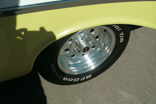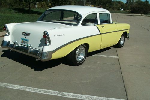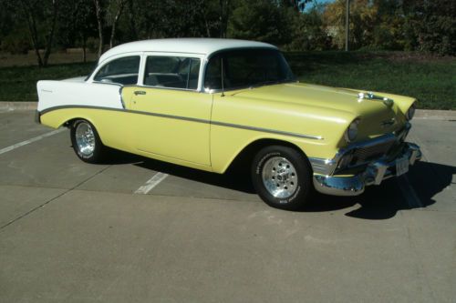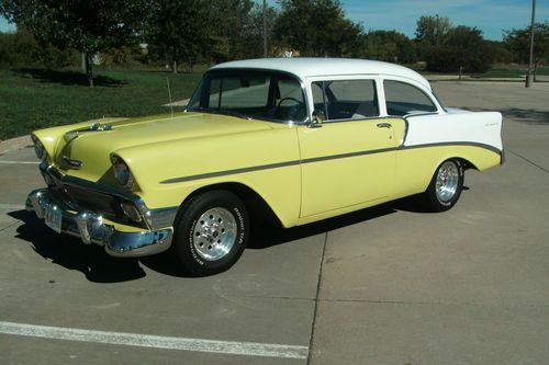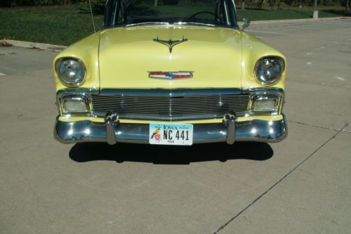 this is a 1956 Chevrolet 210 2 door sedan, very solid Oklahoma car it is crocus yellow and white, body and floors are in very good condition, no rust problems, 350 chev engine runs good, 350 tranny shifts and runs down the road great!! paint is very good condition, chrome is nice, stainless in nice shape, interior is older but no tears, listing for friend please call for any questions 515-240-5754 happy bidding !!