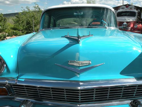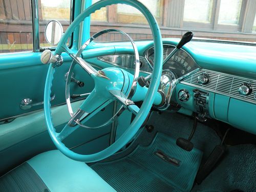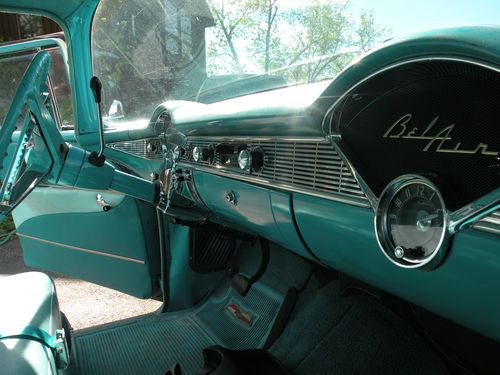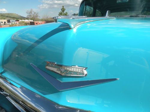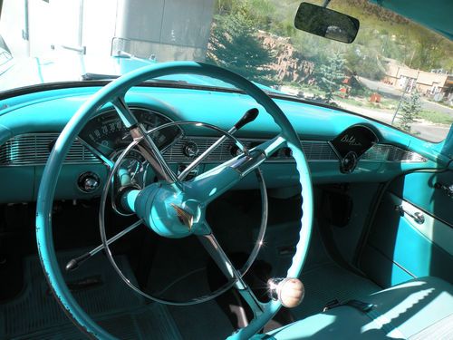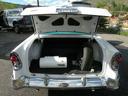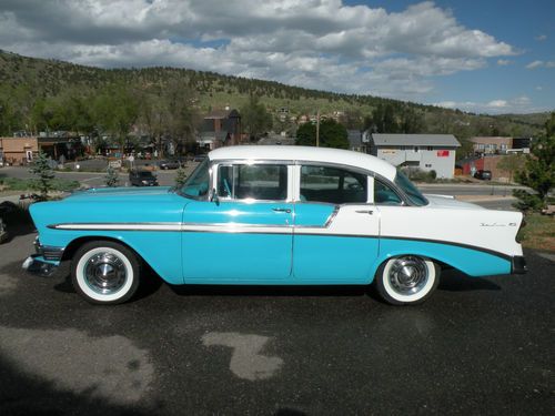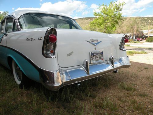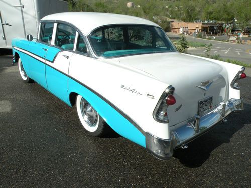 Classic 56 Chevy , Beautiful, great condition , Has minor flaws in paint, although on a 1 to 10 it is way above average . Look at all photos for detail. This car came from Nebraska, belonged in same family for years and years. Barn stored, corn fed. Has the tube window a/c. Underside is also in above average condition. Runs great, Has the suicide knob on steering wheel. Wide whitewalls, Being sold as is, with no warranty or freebees. Has the V8 265cid Power Pac,@208 horsepower, Powerglide transmission, and duel exhaust. Instrument cluster all working, newer chevy radio. This car is ready to soup up! If you want to keep it stock, it is very clean and ready to do the cruise in.You are welcome to kick the tires, check the oil, and drive it, we are near Boulder Colorado. I have never sold a car on ebay, so not sure of details, but I think all #,s are right for what it is worth. Currently the car is being used in Leonardo DiCaprio's "Dear Eleanor" movie (starring Luke Wilson and Jessica Alba), being filmed here in Colorado. It may need to be kept here for 3 more weeks, at the request of production staff. Also I am serious about selling, feel free to make offer.
