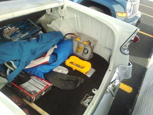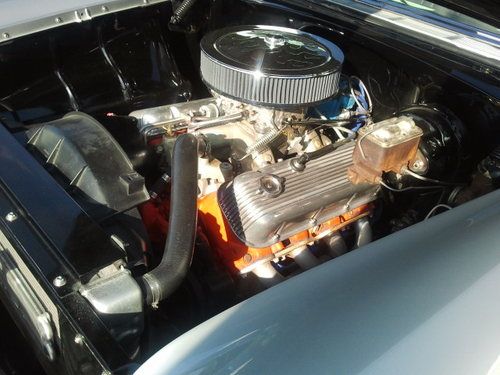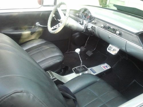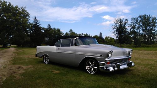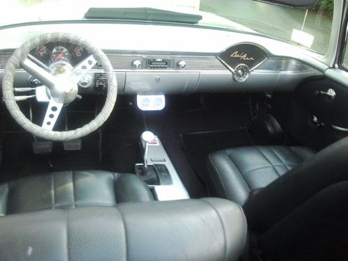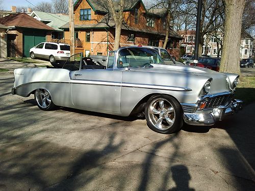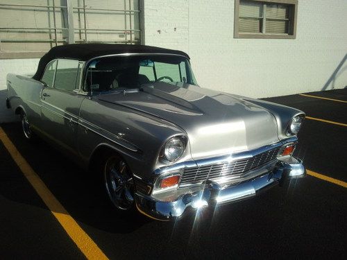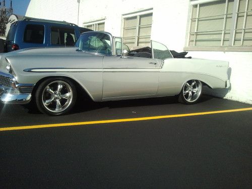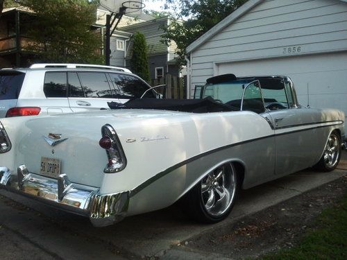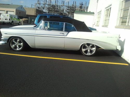 This is a beautiful fram off restored 1956 BelAir convertible. It has approx 9,000 miles since a complete restoration. The car has a 454 mild built motor, not sure on the internals but it has a smooth idle and good pick up. It is backed up by a rebuilt Turbo 350 Transmission that has about 2500 miles oon it. I converted it from a 4 speed a couple years back. It still has the clutch pedal and hyraulic set up to turn back to a stick shift. The car has a newer model subframe on it which I was told from a nova. It has power front disc brakes and a 10 bolt rear end. Rear air shocks. It has a highway gear and goes about 80mph at 2500 RPMs. It has a nicely detailed engine bay with a smoothed firewall and all wires tucked away. IT has power steering and an aluminum radiator. IT has an optima battery mounted in the trunk. The interior is done nicely with a fake leatehr material with an osterich type of insert. IT has later model bucket seats which are very comforaible. IT has an early model counsole out of a Chevy with a Lokar shifter in it. The dash is painted nicely with aftermarket guages. IT has a new radio with ipod hook up designed to look like original radio. The 2 tone paint is done very nicely with a clear coat and I would rate it very nice driver quality, not a show car. I do drive it on nice days only. IT has an aftermarket cowl scoup on a steel hood. There are minor chips and little scratch here or there. The bumpers are all new remanufactured. IT has a very nice Hartx cloth top which looks great on the car. It is a manual top. The rims are coys with 20's on the back and 18's on the front.