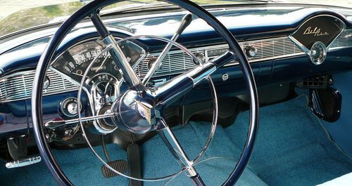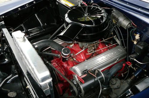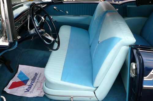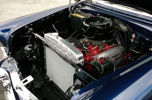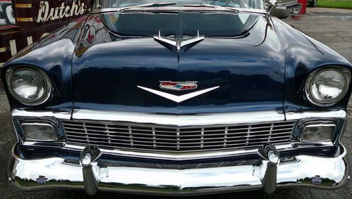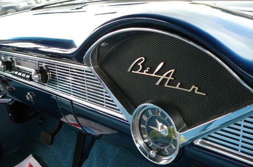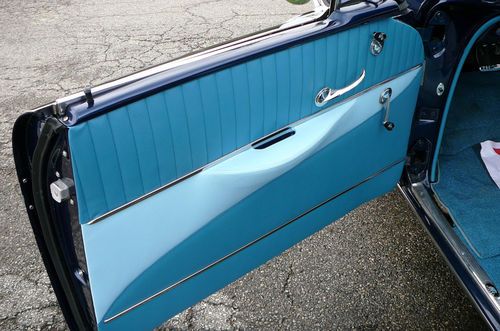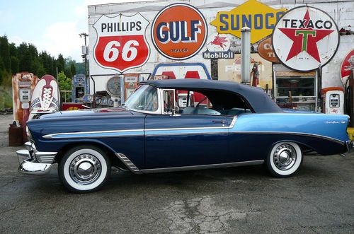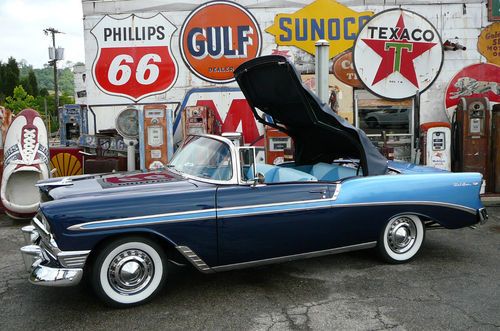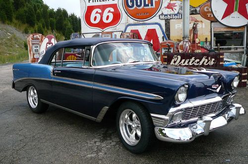 1956 Chevrolet Convertible Of all the classics we have owned this is by far the best quality and the most eye pleasing one we have handled to date. This is a fresh, just completed frame off restoration. When we traded for it it was about 90% finished. We finished the car and have driven it as to work out all the bugs. This one is about as close to perfect as they get. The odometer cluster was rebuilt then set to zero. Car had six tenths of a mile at time of trade. Car now has only one hundred twenty miles. It's new and fresh The paint work is of show quality. 56 Chev colors Harbor Blue and Nassau Blue. The new convertible top is Harbor Blue. New padding and new back window. The interior is all new and dead on the original. Carpet is new as is everything else. All works on the car with exception of radio. We have tubes to make radio work-they came with car. We have blue seat belts not yet installed that come with car. Horn blows, all gauges work, speedometer works, all top components are new and it works fine. Yes original factory clock does work. All chrome is awesome quality. All the stainless is highly polished to show quality. All wiring is new, All nuts and bolts used throughout are new and all new under hood. Looking down the sides of her-she is straight. All stainless is straight. Driving this car is fun. rebuilt original numbers matching motor and transmission were rebuilt. It starts, runs, and drives as good as any. New carburator and even a new air cleaner. They added the early style Corvette valve covers and as pictures show a high dollar aluminum radiator. If painted black it looks dead on the the original radiator. The engine compartment looks great and ready to be judged at any show. All the exhaust is new, very quiet. All new exhaust, all new brakes, new bearings, all new bushings and rubber seals have been replaced. Top Notch restoration. I can't think of much that this car needs. Just hit the key and go. As pictures show the bottom of car was finished out nicely and it also shows off the bright new gas tank. New gas lines, new brake lines, all new hangers and new fittings. I could rattle on and on forever about this beauty but the proof is in the pudding. Try to come to Lawrenceburg IN and check it out. It don't get any better than this. Be the first to enjoy a fresh restoration. If you bid and you are the winner and when you come to claim and you don't like it NOT a problem!!! Don't pay, we could careless. We will still give you good feedback and buy your lunch. We used this car in a wedding and in order to make this car match the others we put on four new tires mounted on four new American Racing Wheels, neat set up. Some do prefer wide white walls. The w.w.w. tires are nice, Wheels painted harbor blue. Original hub caps have been redone with all new decals. So it is your choice, you can have the four mags or the four w.w.w. with original 56 hub caps, your CHOICE If you should decide to do the Buy it Now price we will ship all eight tires and wheels. Then we will absorb the cost of shipping it to you. Not overseas unless you pay shipping. we work through a friend here in town who is a professional shipper. He is bonded and fully insured and hauls all over the country. You can call him for information or references JIM AT 831-840-3630-Call us for any information on convertible at 812-537-0585-ask for Gary