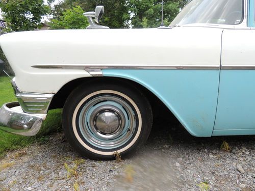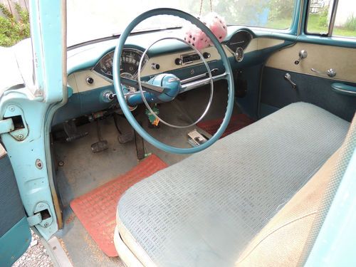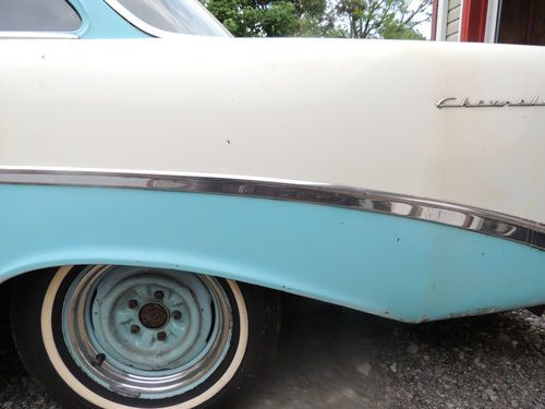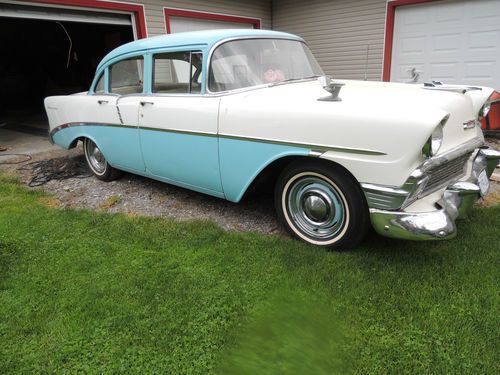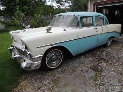 up for bid is a 1956 Chevrolet, 4 door 6 cl. it has 80% original paint, it has never driven in the winter, sunny days only, the driver rear door and quarter anel has had work, my father bought the can new, he was hit in 1959 by a 1949 ford,( an old junk car as he put it) this area needs to be redone, as it has bin over 50 years since fixed, I have ouwned it since 1980, this the first time offered for sale, my heath is the reason for sale, nice solid original car, trunk and floors as new