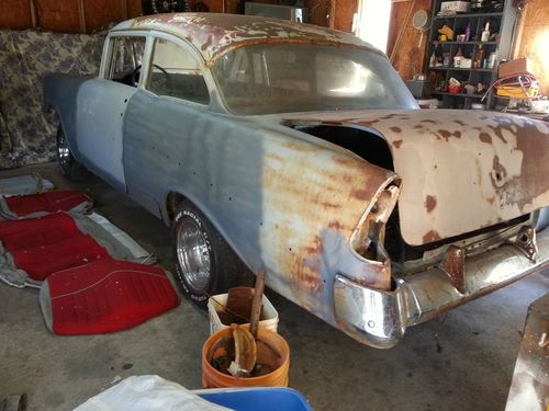 1956 chevy I have all the int, head liner,seats door panels ,side panels like is on the back seat its just laying in there to show what it looks like ,have a lot of trim, bumpers,grill ,all the glass ,have almost everything but a little trim that I don't have like on the drivers side trim , had some patches welded in floor new rocker panels, car is straight around lights is solid ready for rat rod or put back together stock ,