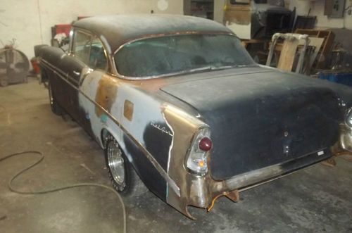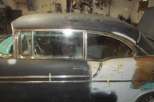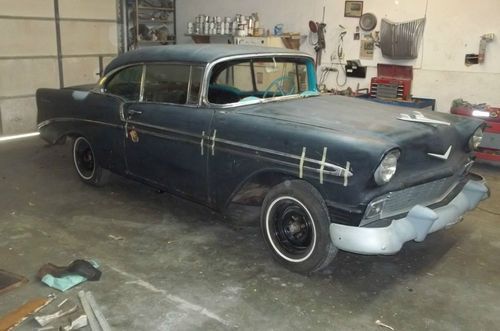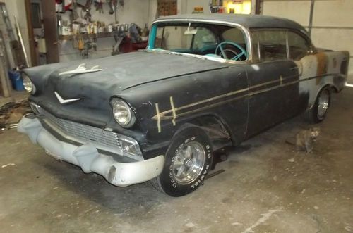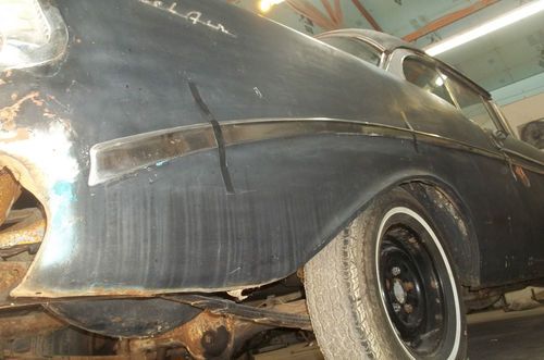 This is a 1956 chevy 2 door bel-air hardtop.This car comes with every piece of trim.Some trim is excellent and some has miner damage but all is driver quality.Good solid restorable car.Has new rear tailpan and partial trunk floor replacement.All body panels can be saved with patch work.The grill and front end components are solid but the previous owner made the car a dale earnhardt tribute and painted the bumpers and grille light gray.Good rockers,does need floor pan sections.The core support,splash pans and entire front end are completely original and uncut.Very nice hood and deck lid.Frame and all body mounts are solid.Excellent uncut dash with all the stainless interior trim.Good bumper cores and brackets.Has all the glass minus windshield.Some windows cracked.Solid working door flappers.I didn't primer the bare spots so the repair work can be seen.Left quarter needs some small patch repair.Overall a very good restoration candidate.I bought this to restore but i've decided to sell out.I've got a couple more old muscle for sale.Check out my other auctions.I'm located 15 miles east of St.Louis.I have more pictures I can email.clear Tennessee title.very reasonable reserve price.thanks again.
